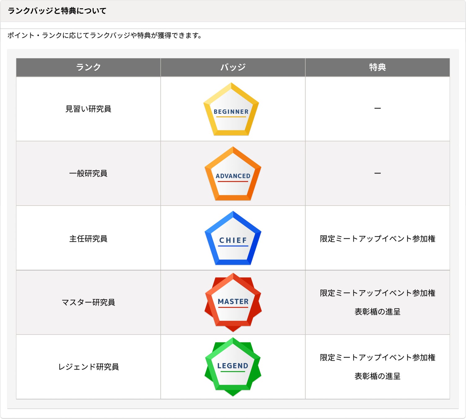 研究員のランクにより、ノベルティや限定ミートアップイベント等へのご招待などの特典がございます