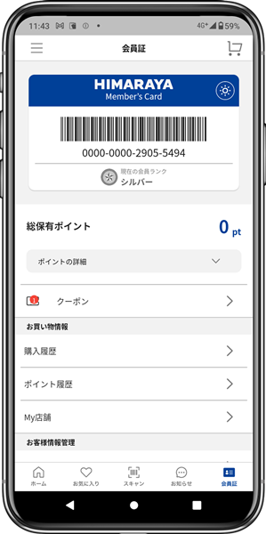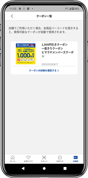 各種情報を解りやすく一覧で表示、会員証を提示するだけでお持ちのクーポンをスムーズにご利用いただけます。