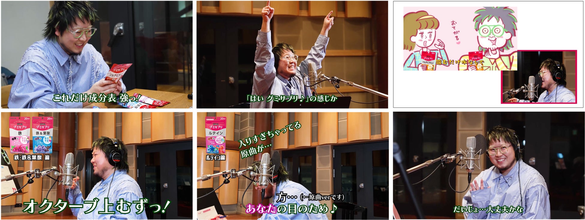 録音は都内某所のスタジオにて実施。ミーティングのあと、ブースに入ってCMソング用の歌詞を歌うこっちのけんとさん。その瞬間…聞いていたスタッフから「本物だ…」という感動の声が!その後、「はい グミサプリ♪」の歌い方を商品名を目立たせるか、それとも原曲に寄せるかなど、いろいろな提案をいただきながら順調に録音が進んでいました。しかし、途中でどうしても原曲の歌詞を歌ってしまう場面も。これを聞いたスタッフはさらに「本物だ…!」という声をあげていました。その後も、ハモリパートやオクターブ上、オクターブ下など、とんでもない量の声を重ねていくこっちのけんとさん。こうやってあのサウンドはできていくんだと、一同が感心した瞬間でした。歌い方などを一緒に工夫して完成したCMソング、ぜひお楽しみください!
