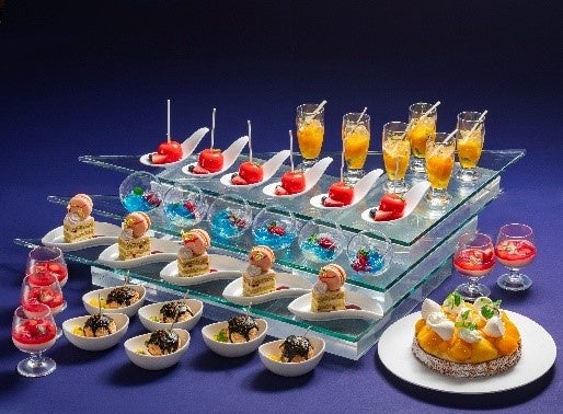 「夏祭り」をテーマに、キャラメルムース仕立てのりんご飴、たこ焼きシュークリーム、金魚が泳ぐゼリーなど心弾むスイーツが並びます。