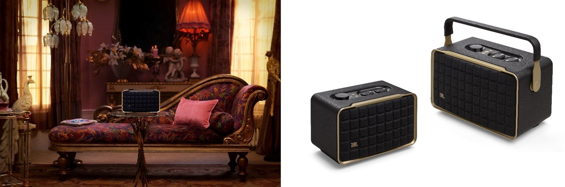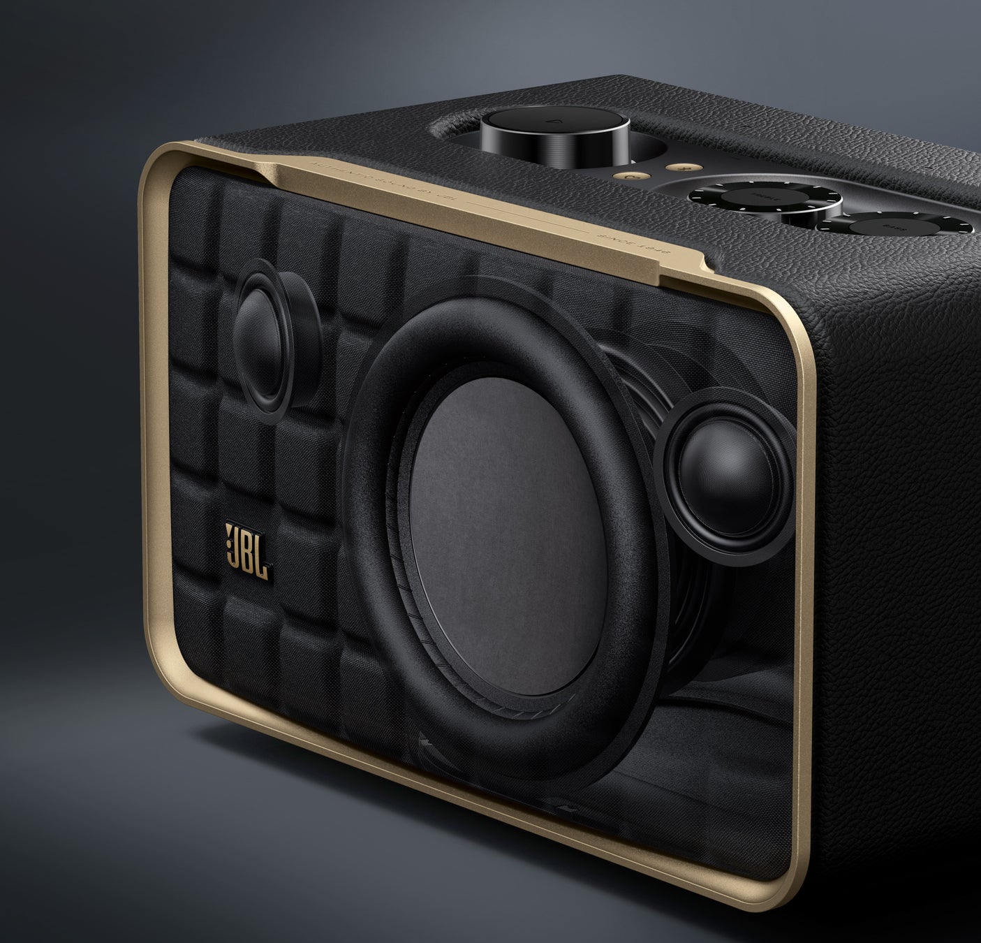 本シリーズのデザインは、1970年代に世界各国で人気を博したスピーカー「JBL L100 Century」をモチーフにしています。「JBL L100 Century」のアイコンともなっている、幾何学的に配置されたキューブ状の「クアドレックス・グリルカバー」を前面に採用し、JBLの歴代の歩みを感じさせるオーセンティックな雰囲気を醸し出しています。また、ボディの要所に使われている、洗練された印象を与える真鍮色のアルミニウムと、全体を覆うレザー調の異素材の組み合わせによって、トラディショナルな要素を現代的に昇華させたインテリア性の高いデザインに仕上げています。さらに、天面には、質感の高いアルミニウム製の音量調整用ノブのほか、バス・トレブル(低音域・高音域)調整ダイヤルも装備しているので、直感的に本体で音の調整をすることが可能です。