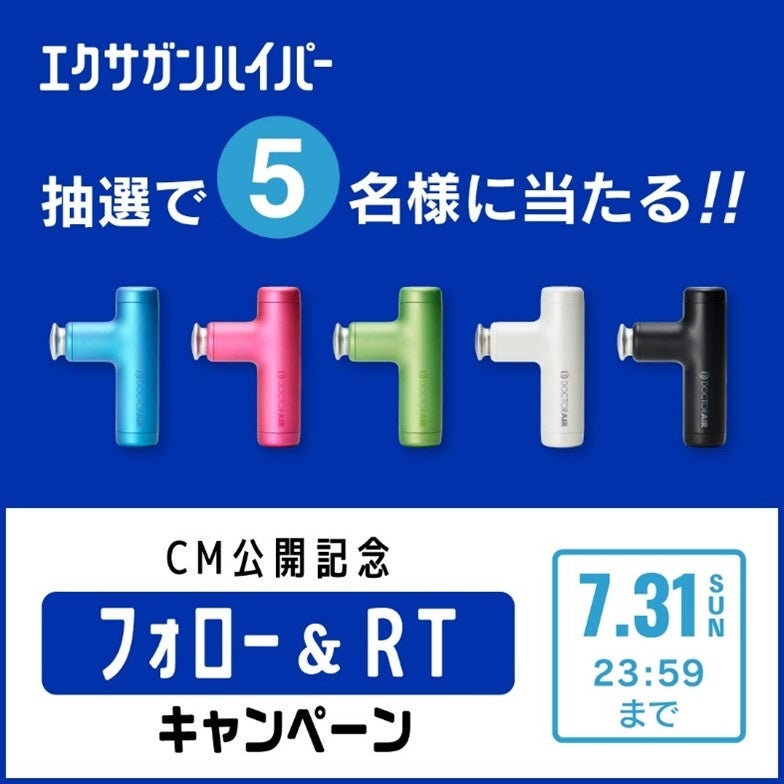 キャンペーン期間中にドクターエア公式Twitter、Instagramよりご応募いただいた方の中から、抽選で5名様に、2022年4月に発売し新CMにも登場する、ドクターエアシリーズ最軽量を誇り、自宅でも出先でも片手でボディケアができる【エクサガン ハイパー】をプレゼントいたします。キャンペーンの詳細は、下記「キャンペーン概要」をご覧ください。