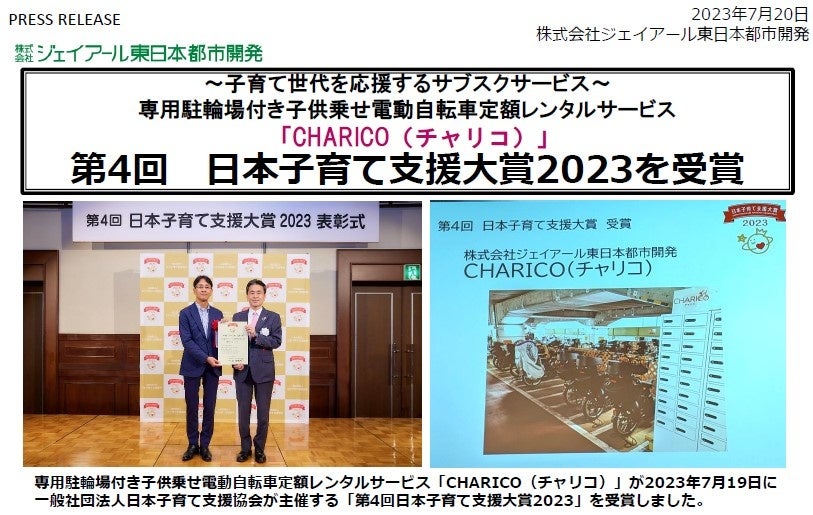 専用駐輪場付き子供乗せ電動自転車定額レンタルサービス「CHARICO(チャリコ)」第4回 日本子育て支援大賞2023を受賞