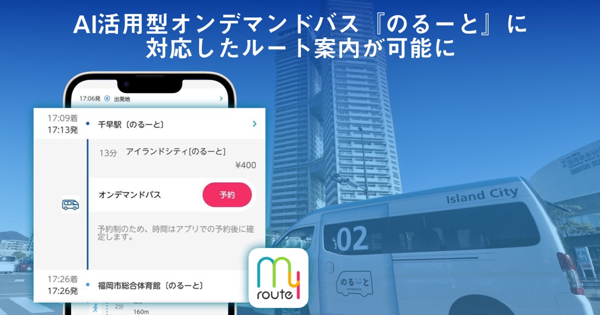 対応エリアはアイランドシティエリア(福岡市東区)で、『my route』のルート検索にて『のるーと』を含む経路が表示された際は、検索結果からそのまま予約専用アプリに遷移し、予約を行うことができます(※)。