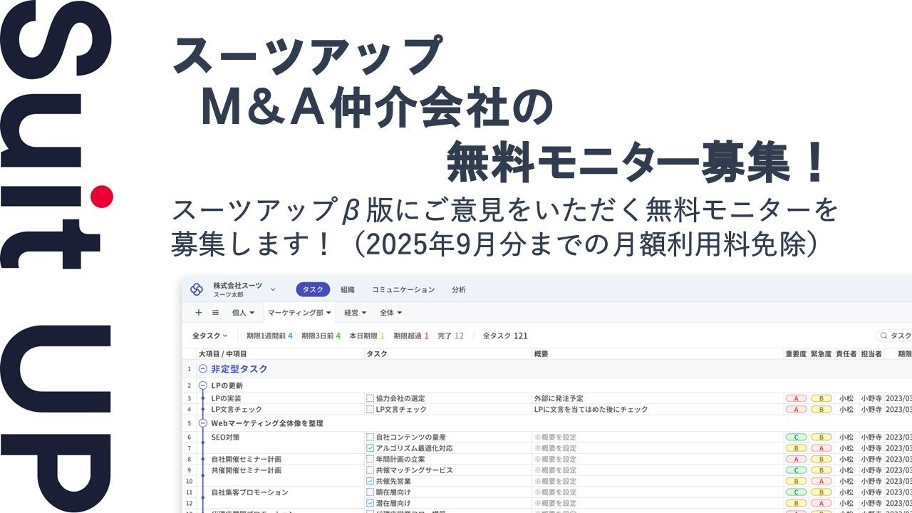 株式会社スーツ(所在地:東京都千代田区、代表取締役社長CEO:小松 裕介)は、チームでかんたん、チームのタスク管理・プロジェクト管理ツール「スーツアップ」において、M&A仲介会社の無料モニターを募集いたします。