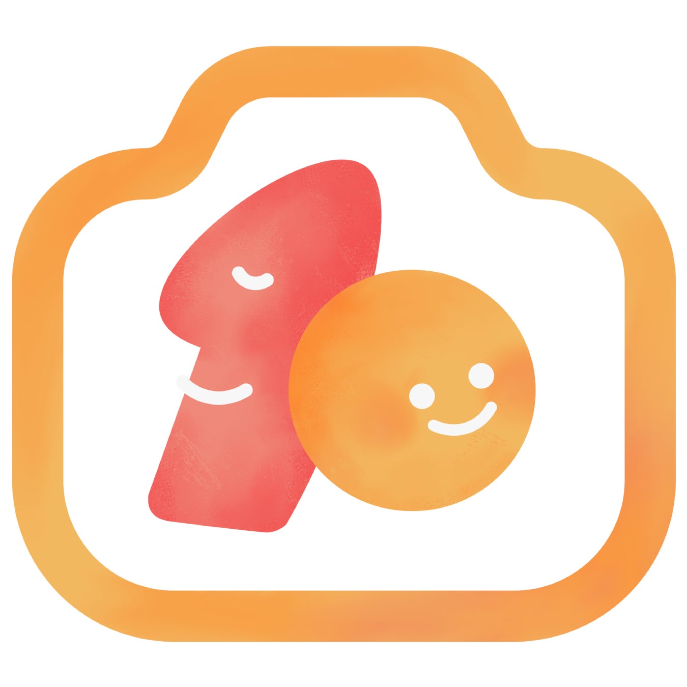 カメラの外枠、1と0を人の顔に見立て、ふたりが寄り添う、あたたかみのある色使いのロゴ。
