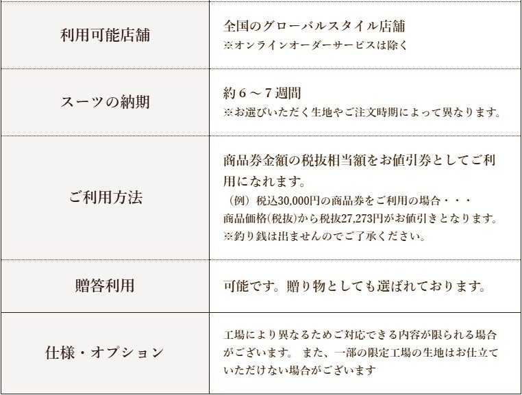 グローバルスタイルのオーダースーツ商品券は多くの方にご好評いただいております。全国のグローバルスタイルの店舗でご利用いただけます。