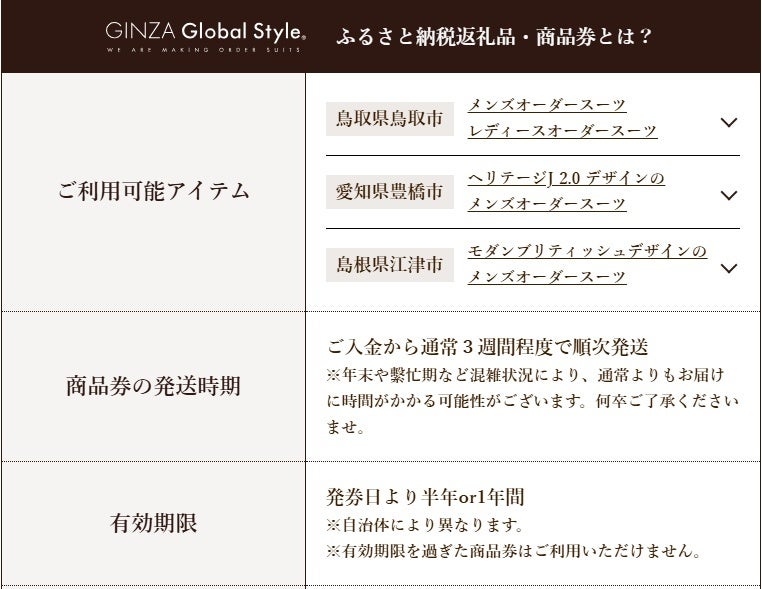グローバルスタイルのふるさと納税の返礼品では、鳥取県鳥取市の他に愛知県豊橋市、島根県江津市の各自治体にて、グローバルスタイル全店で利用可能な「オーダースーツ商品券」をご用意しております。
