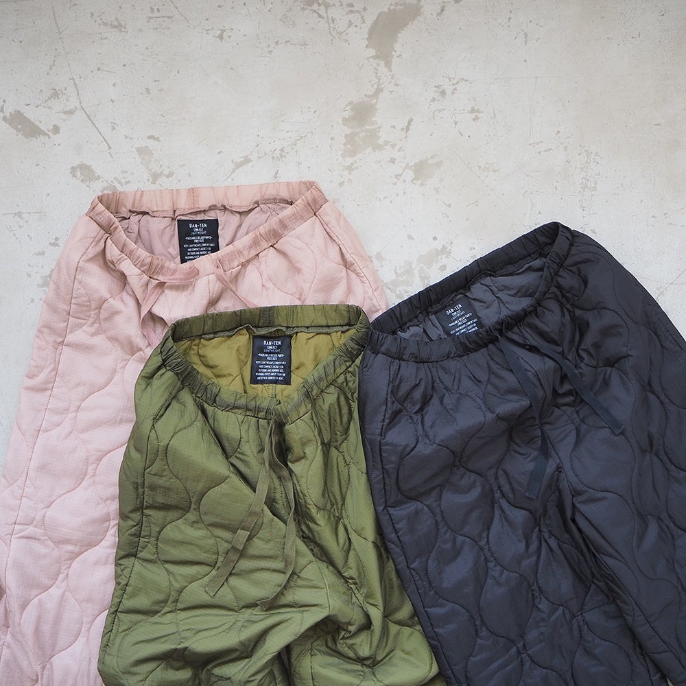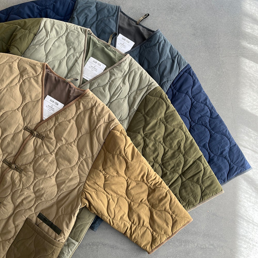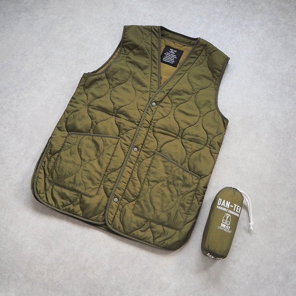 米軍M-65フィッシュテールパーカーのライナーを模したヒョウタン型キルティングを施した軽量なDAN-TENです。 今期はツヤを抑えた素材に変更し身頃、袖などのパーツをクレイジーパターンに組むことで新鮮なイメージに仕上げました。また、より羽織りやすく、綺麗なシルエットになるように各所のサイジングも変更しアップデートしています。 付属の袋に収納可能なパッカブル仕様で、収納時には枕にも。また、持ち運びや自宅での保管時に便利です。