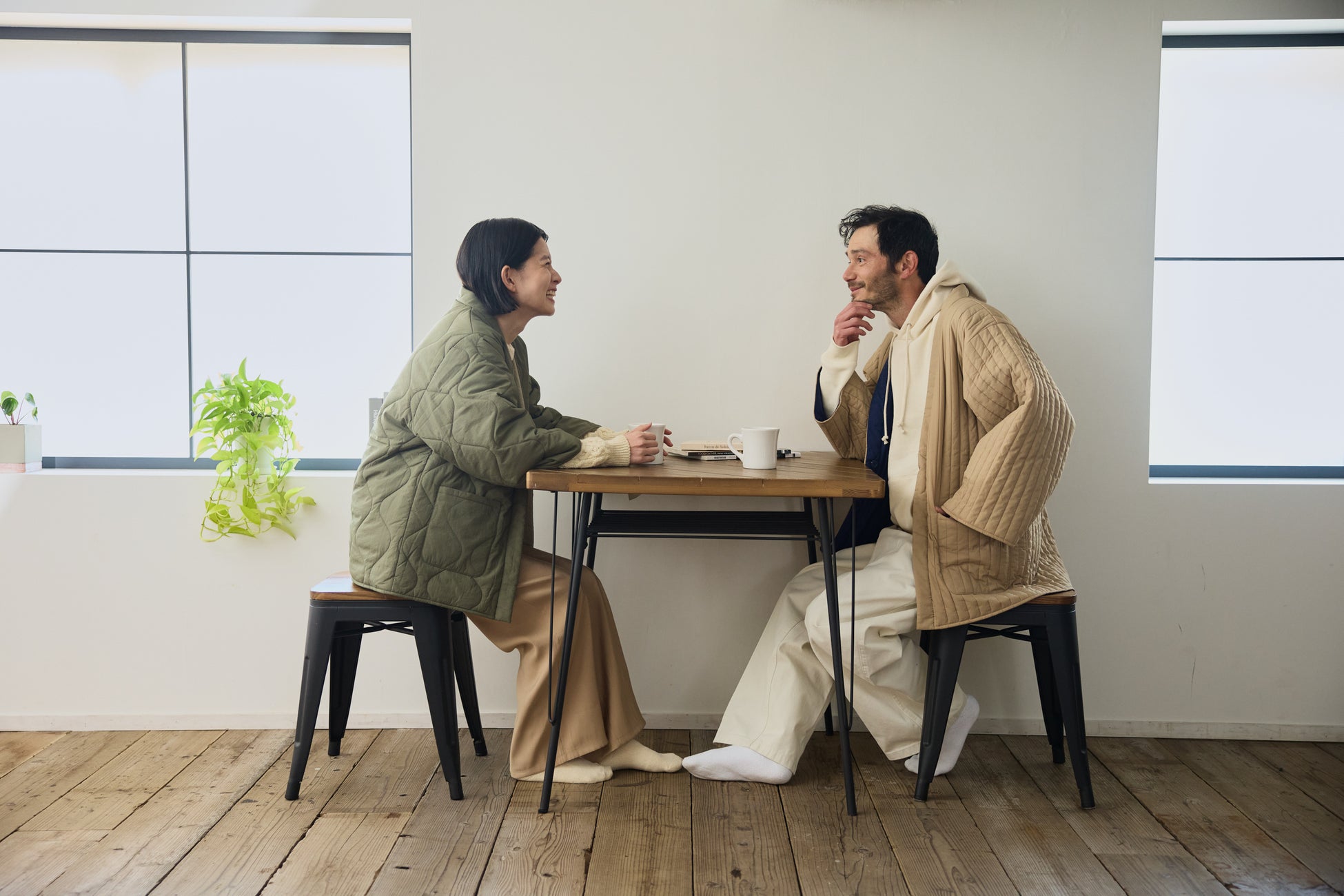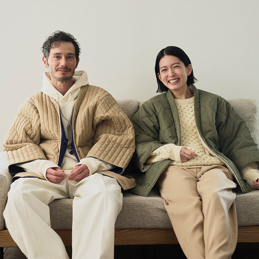 セットアップでの着用や、家族やパートナーとの兼用もできるサイズ展開で、様々なライフスタイルに合わせたはんてんスタイルを提案しています。