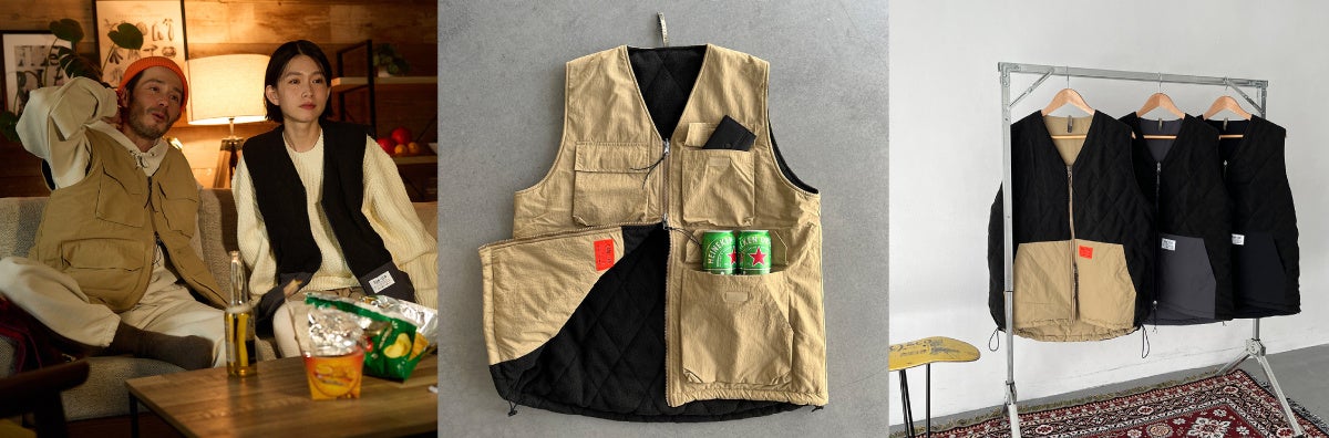 アウトドアウェアを思わせる機能的で大きめポケットが印象的なデザインで、ナイロン素材を使用した表面とフリース素材にダイヤ柄のキルティングが施された裏側の印象が異なるリバーシブル仕様。