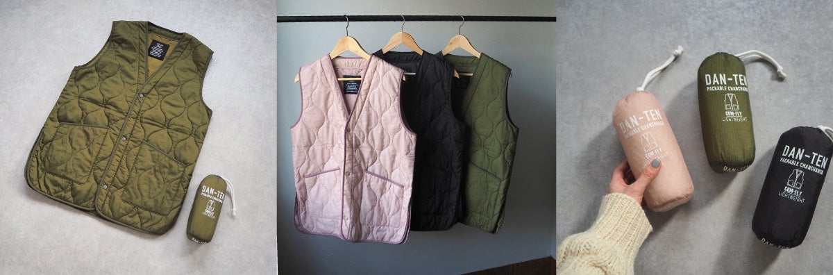 今シーズンは従来のDAN‐TENをより軽量・コンパクトにした【コンフリーライト】が新たにラインアップ。薄手のリップストップ生地を使用した通常のはんてん型、袖無しのチャンチャンコ型、セットアップとして着用できるパンツの3種類をそろえました。