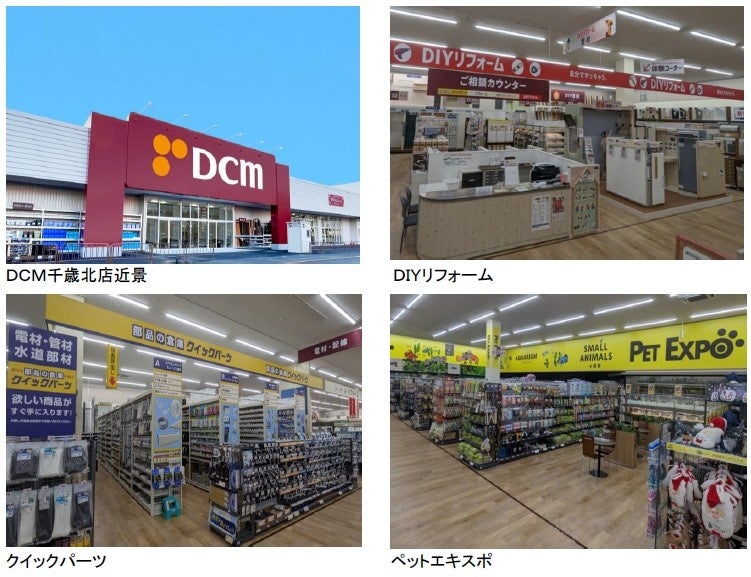 DCM千歳北店は、北海道内では86店舗目、DCM全体で665店舗目の出店です。店舗でお客さまご自身でのリフォームを提案する「DIYリフォーム」、プロの職人の方々が現場で必要とする電材・水道部品などがすぐに手に入る「クイックパーツ」コーナーを展開しています。また、「ペットエキスポ」では、熱帯魚コーナーを広く展開するなど、ペット用品を豊富に取り揃えています。
