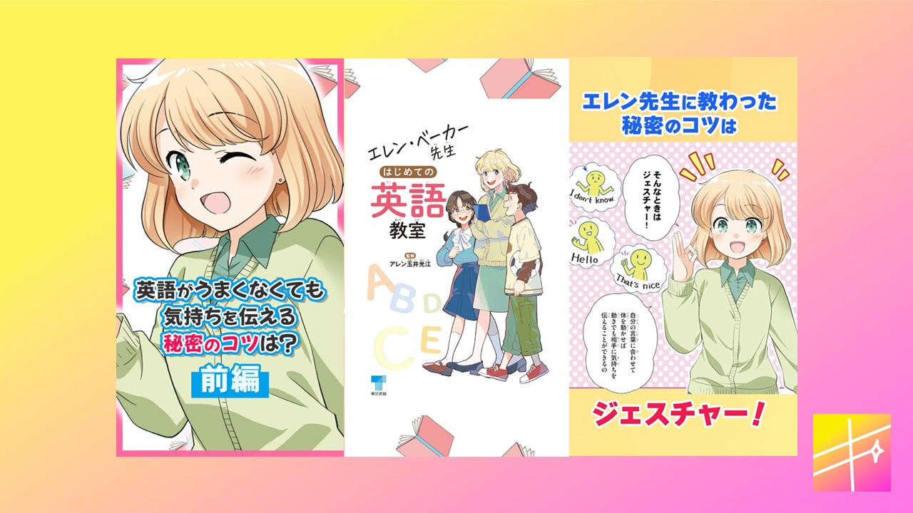 今回配信するのは、東京書籍が発行する小学校英語教科書『NEW HORIZON Elementary』に登場する人気キャラクターであるエレン・ベーカー先生が活躍する2作品です。2024年4月に発売された書籍2点の内容をベースに、短い時間で楽しく英語を学べる動画や、エレン先生の魅力がたっぷり詰まった動画を配信します。また、書店向けにQRコード付きの専用拡材を提供するなど、書店店頭と連携した取り組みも推進しています。