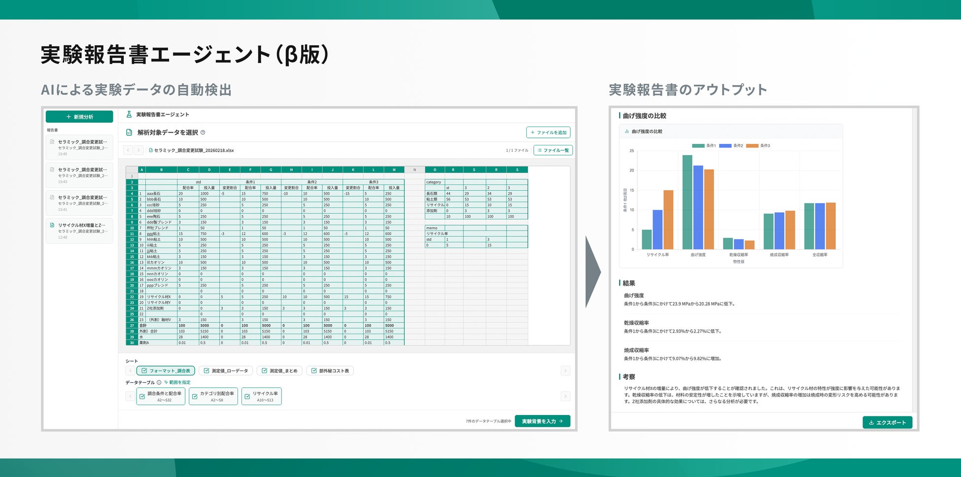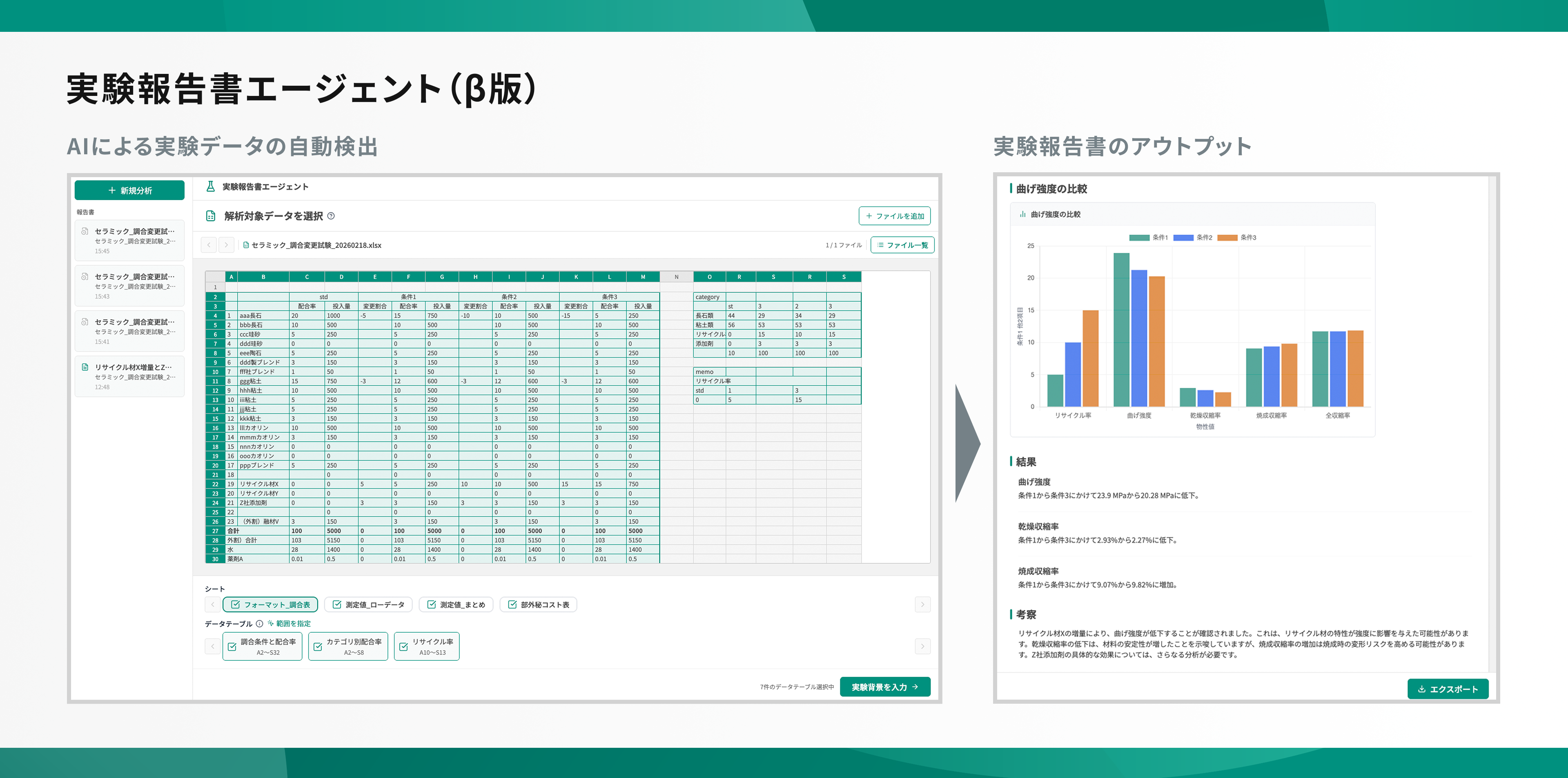Excelの実験データを取り込むだけで、AIが不足情報を対話形式で補完し、体裁の整った実験報告書を自動生成します。