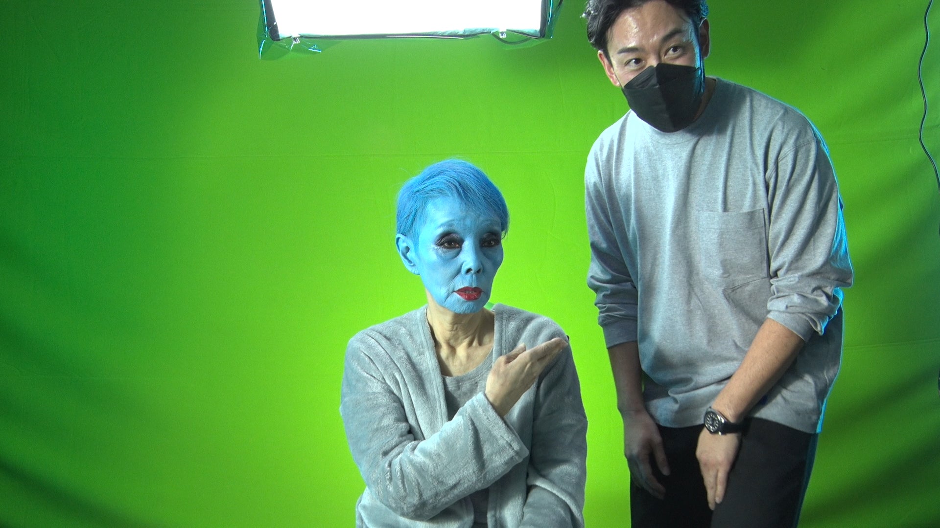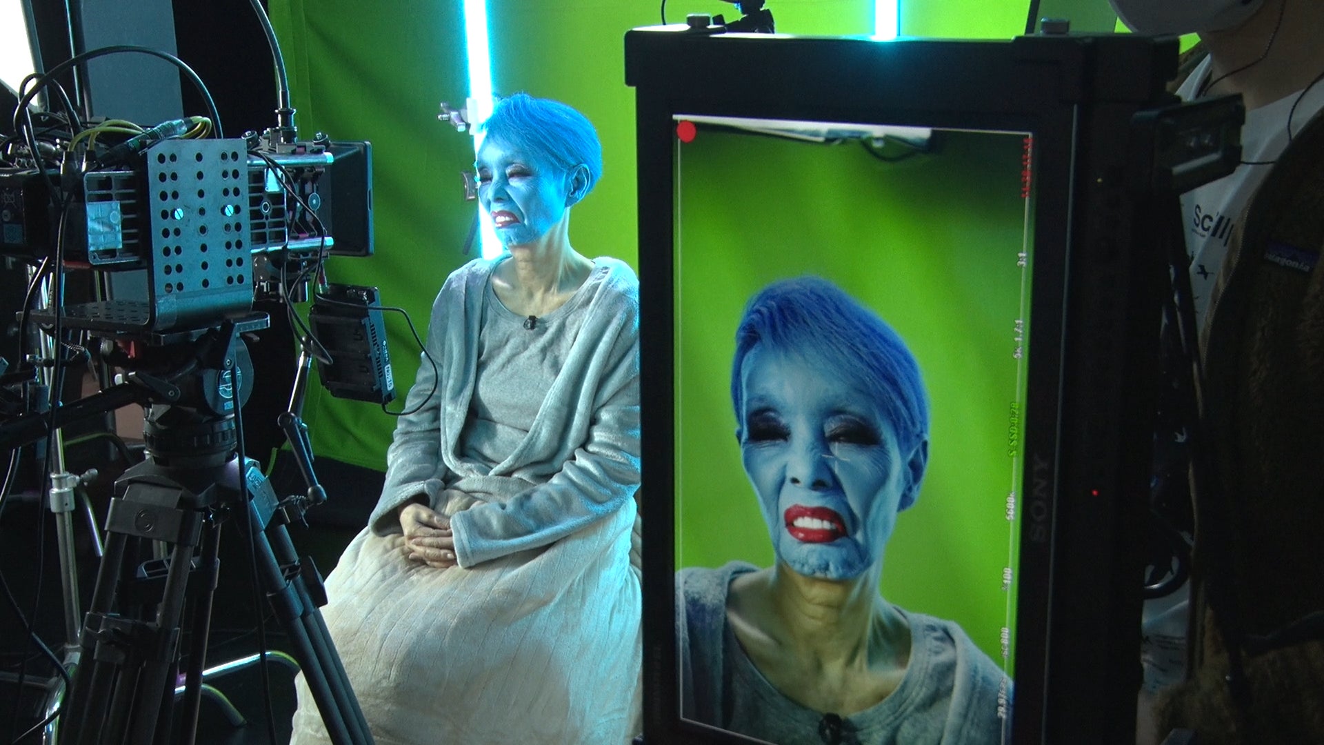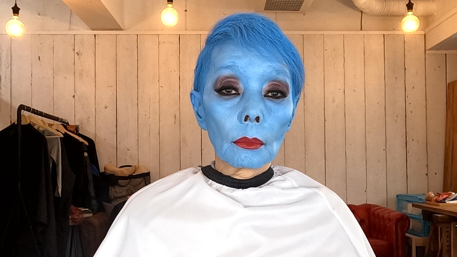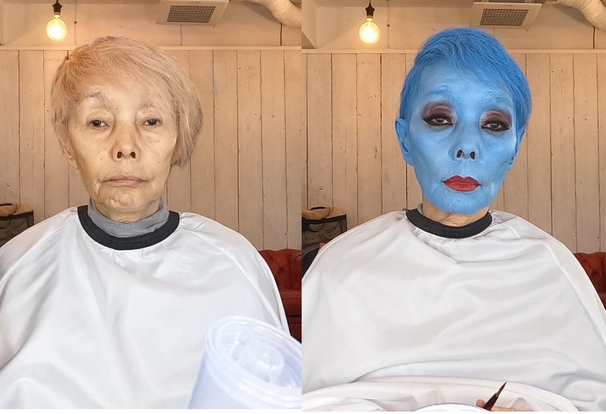 撮影では、引っぱられる表情に対するスタッフの様々なリクエストに、「いいのよ、何言っても」とノリノリで対応していただきました。また、撮影後のインタビューでは、完成まで2時間半かかった真っ青なスライムメイクについて全く触れない聞き手に対して「すごい時間かけたんだから、いじってくださいよ」とコメントし、メイクをテーマにしたクセのある質問の数々に、研さんらしい切り返しを織り交ぜながらご回答いただきました。全体を通じて、芸能界で長くご活躍されている研さんの懐の深さを感じる撮影となりました。