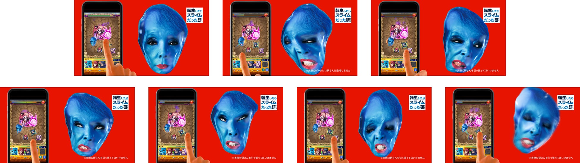CMでは、ゲーム画面のボールに扮したスライムメイクの研さんの顔が、モンストを操作するプレイヤーの指の動きに合わせて自由自在に引っぱられます。プレイヤーがボールをはじく方向を迷えば迷うほど、顔が色々な向きに引っぱられて困り続ける研さん。最終的にはプレイヤーに弾かれた研さんが「わ~~~~!!」という絶叫とともにゲーム画面から飛び出してしまう、研さんのメイクと表情が印象的な内容です。