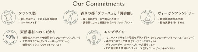 環境と使う人に配慮した、天然素材によるヴィーガンホームフレグランス。グラースの熟練の調香師が創り出す洗練された香りと、プロバンスを体現した上品でやわらかなボタニカルデザインが空間に溶け込み、インテリアにリラックスした雰囲気を作り出します。