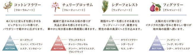 左から コットンフラワー、チェリーブロッサム、シダーフォレスト、フィグツリー
