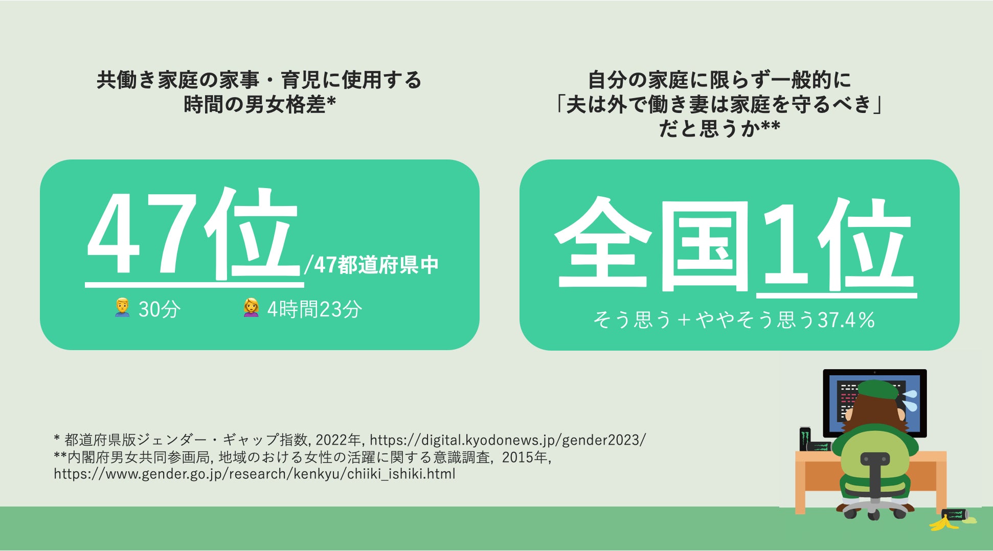 山口県出身、大学進学をきっかけに福岡市へ居住。福岡市が大好きになり、大学卒業後、福岡市役所へ入庁。2回の産休・育休を経て、令和2年度より市民局男女共同参画課に配属される。現在は、福岡市の男女共同参画推進に向けて、地域での研修や計画の進行管理を担当している。小学生女子2人の子育て中。