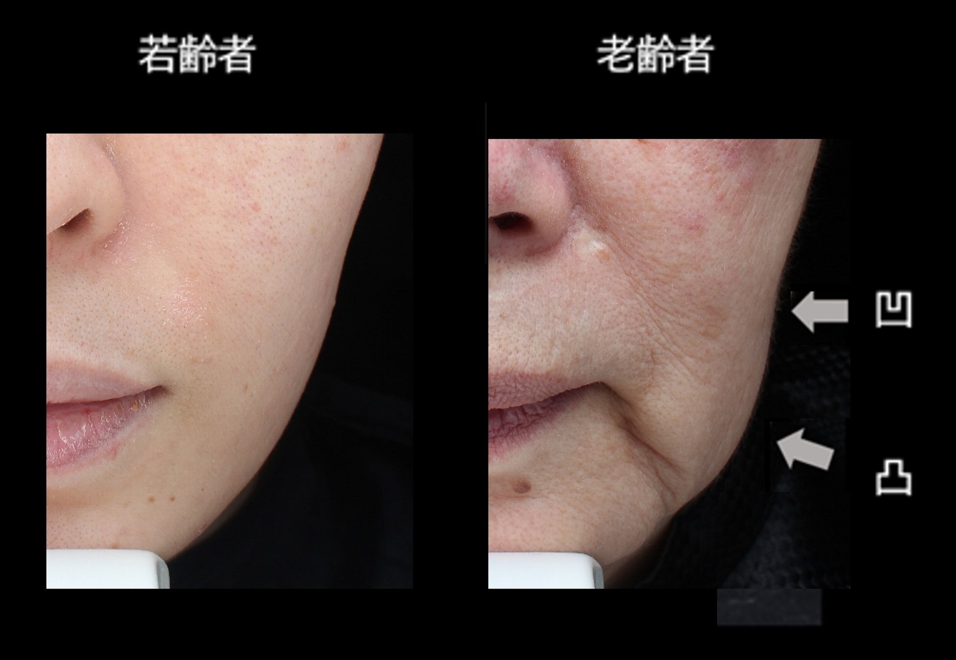 顔面画像の丁寧な観察を行ったところ、加齢に伴う変化として顔の表面に現れるほうれい線や口元から顎に向かって現れるマリオネットラインなどのシワの発生に加えて、肌の外側のフェイスラインの変化に一定の傾向が見られました。つまり、フェイスラインに沿う頬骨の下辺りには凹み、口の横あたりには凸があることがわかりました。これは骨格や丸形・角形などの顔の形を問わず現れている現象でした。