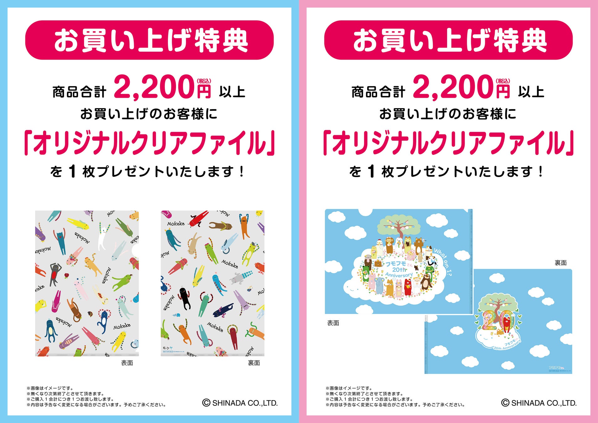 会期中、会場にて「モケケ」または「フモフモさん」関連商品を1会計2,200円(税込)以上お買い上げのお客様に「オリジナルクリアファイル」を1枚プレゼントいたします!※クリアファイルの種類は2種類(モケケとフモフモさんでそれぞれ1種)あり、どちらか1点お好きな方をお選びいただき1枚プレゼントとなります。
