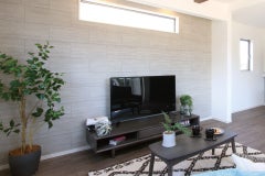 リビング一部に造作壁を設け、コンクリート質感のアクセントクロスを施しました。テレビなどAV機器の配置にも適しており、お洒落でこだわりの空間を彩ります。