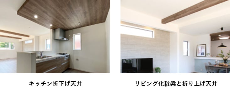 キッチン上部は、アクセントクロスをあしらった折下げ天井の仕様です。忙しい家事の時間を華やかに演出します。リビングには、化粧梁が見える折り上げ天井の仕様として開放感のある優雅なリビングをデザインしました。