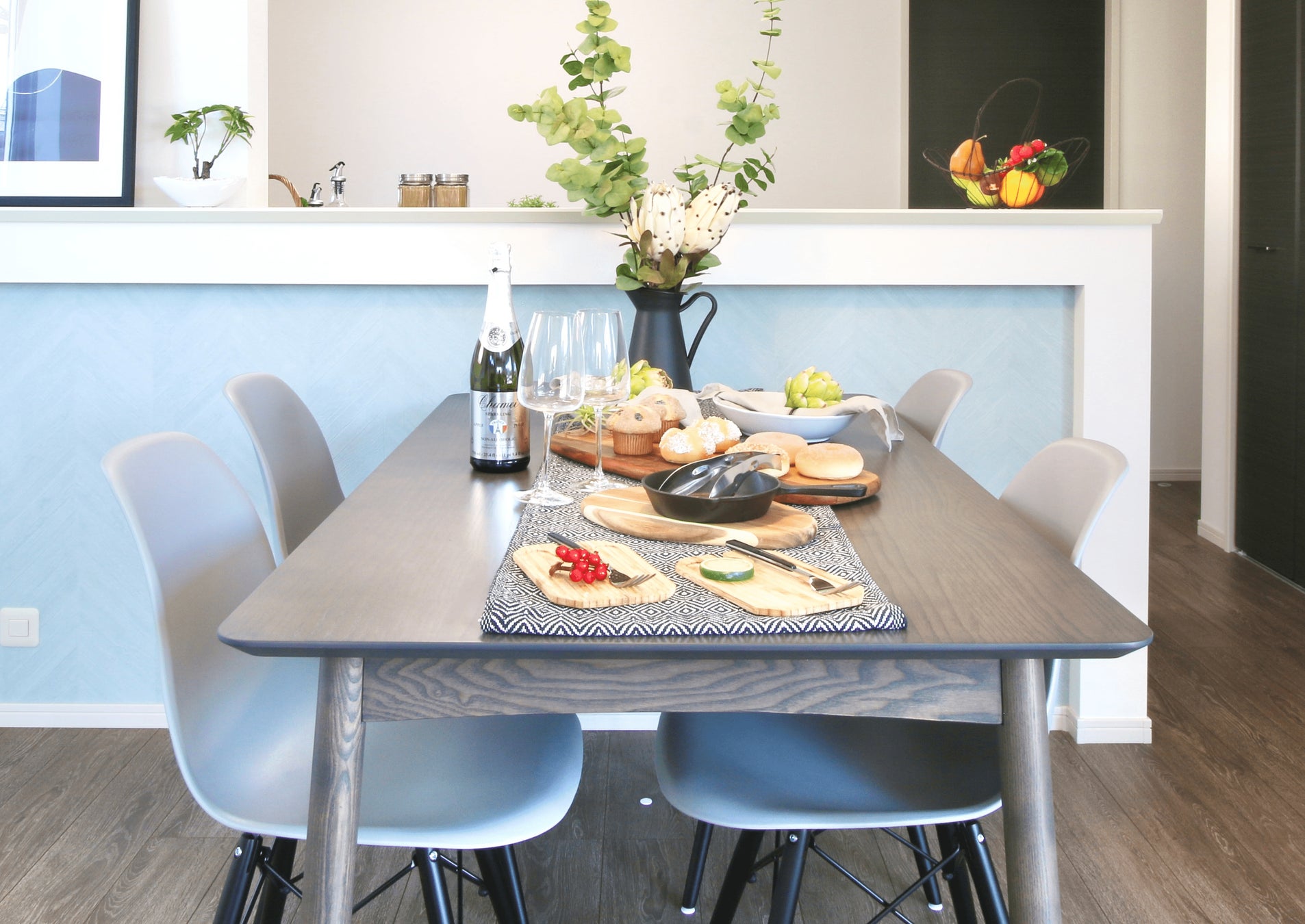キッチンにはおしゃれなゲートスタイルカウンターを標準装備しました。カウンターの正面が「門」のように縁取りされ、カウンターの部分がリビング側に少しせり出ているデザインです。さらにレンジ台の前の壁をなくし、LDKと一体感を保てるように設計しました。