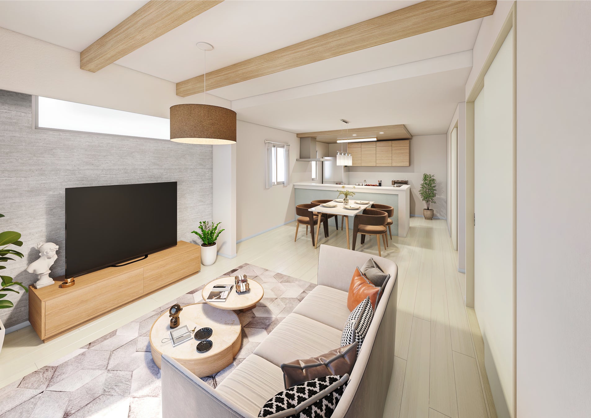 新商品の「priSUMA(プリズマ)」をプランニングするにあたり、お客様のご要望を反映できるよう「お客様の声」を集めました。その中で「分譲住宅の立地や価格は魅力的だが、デザイン面は諦める部分がある」、「価格は抑えたいけど、おしゃれな家に住みたい」、「一生に一度の大きな買い物なので、格好いいデザインが良い」など外装、内装のデザインに対する声に着目しました。その結果、外装は建物に凹凸をつけて立体的かつ重厚な印象に、内装はLDKの天井や壁一面に造作を設け、お客様の声から特に人気の高いデザインを取り入れました。