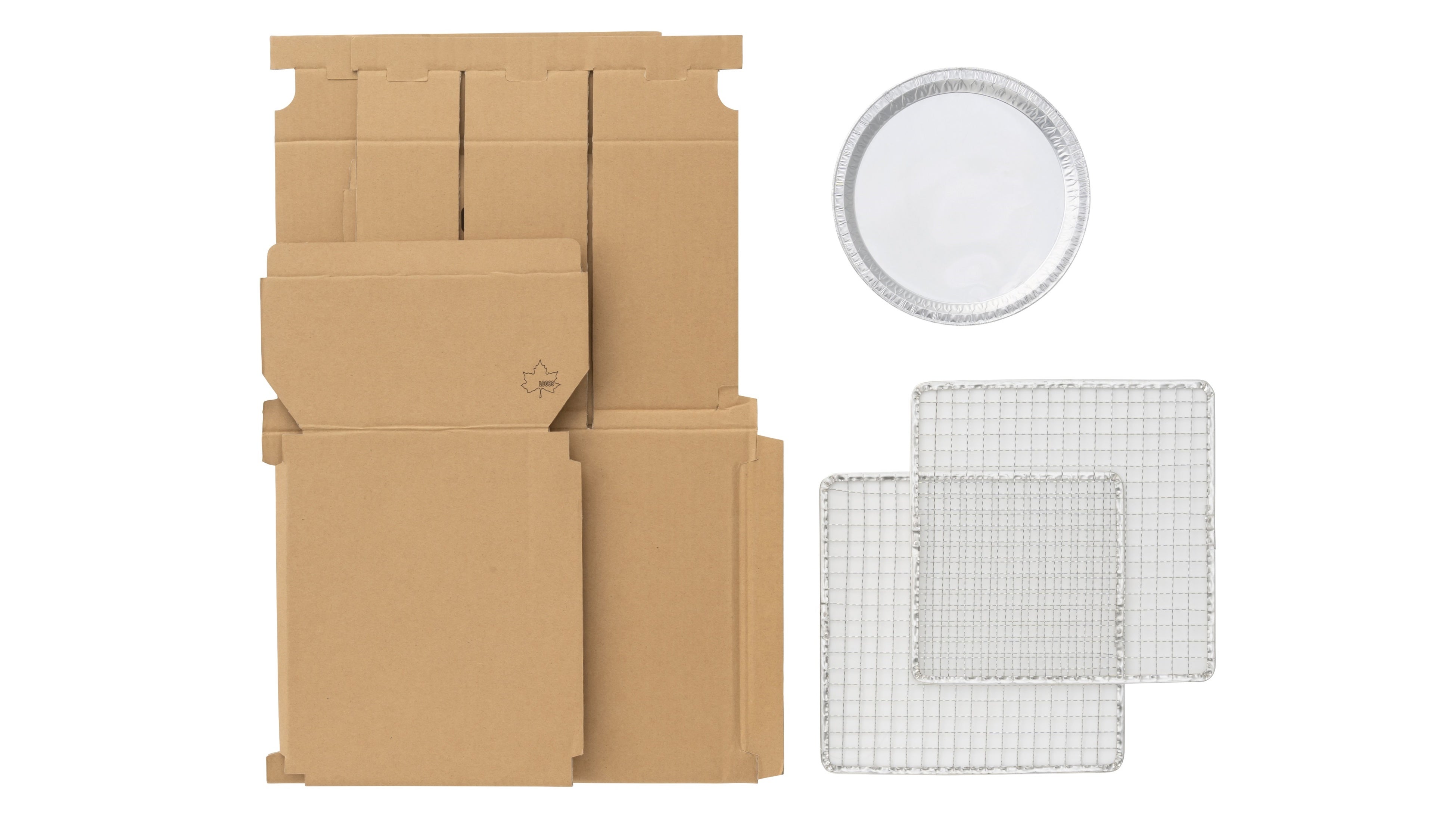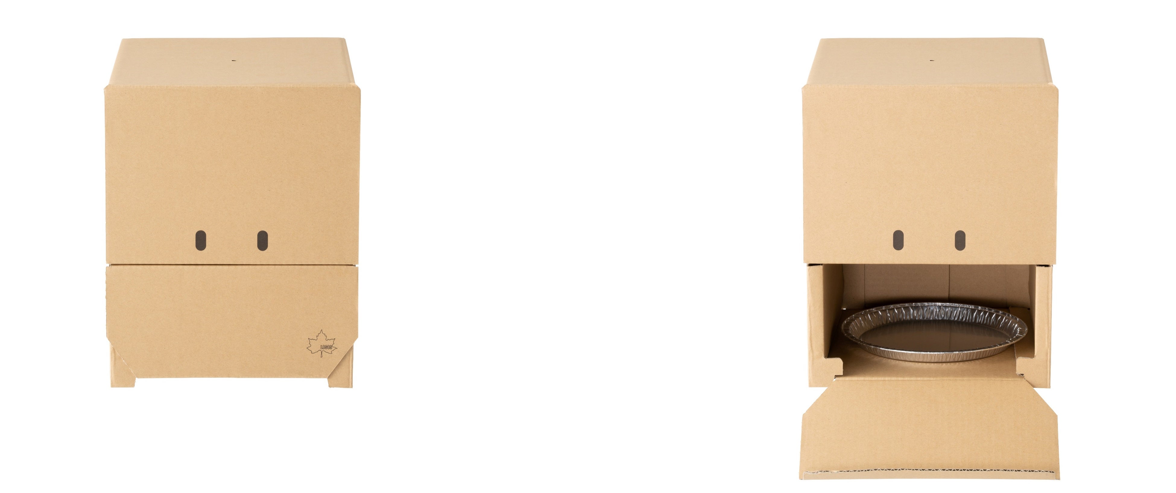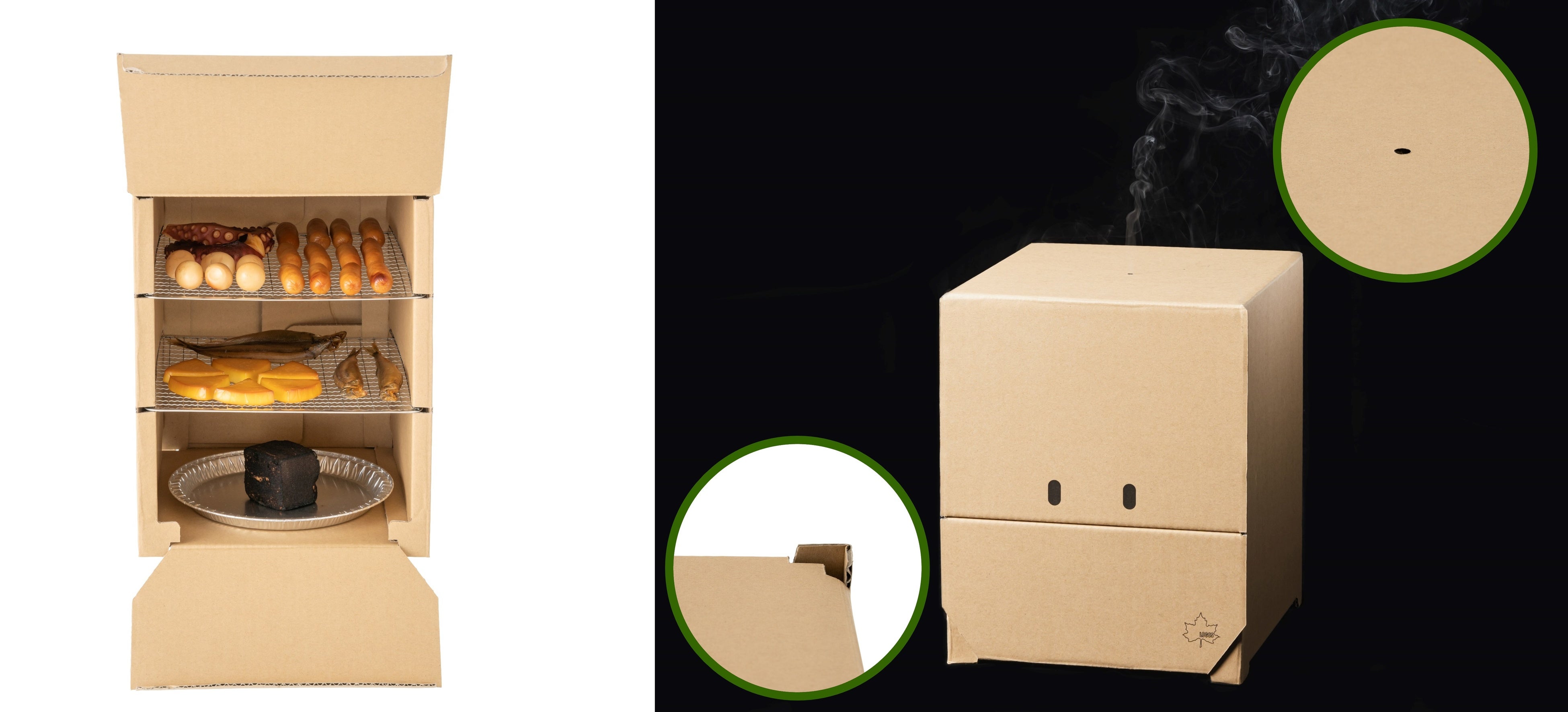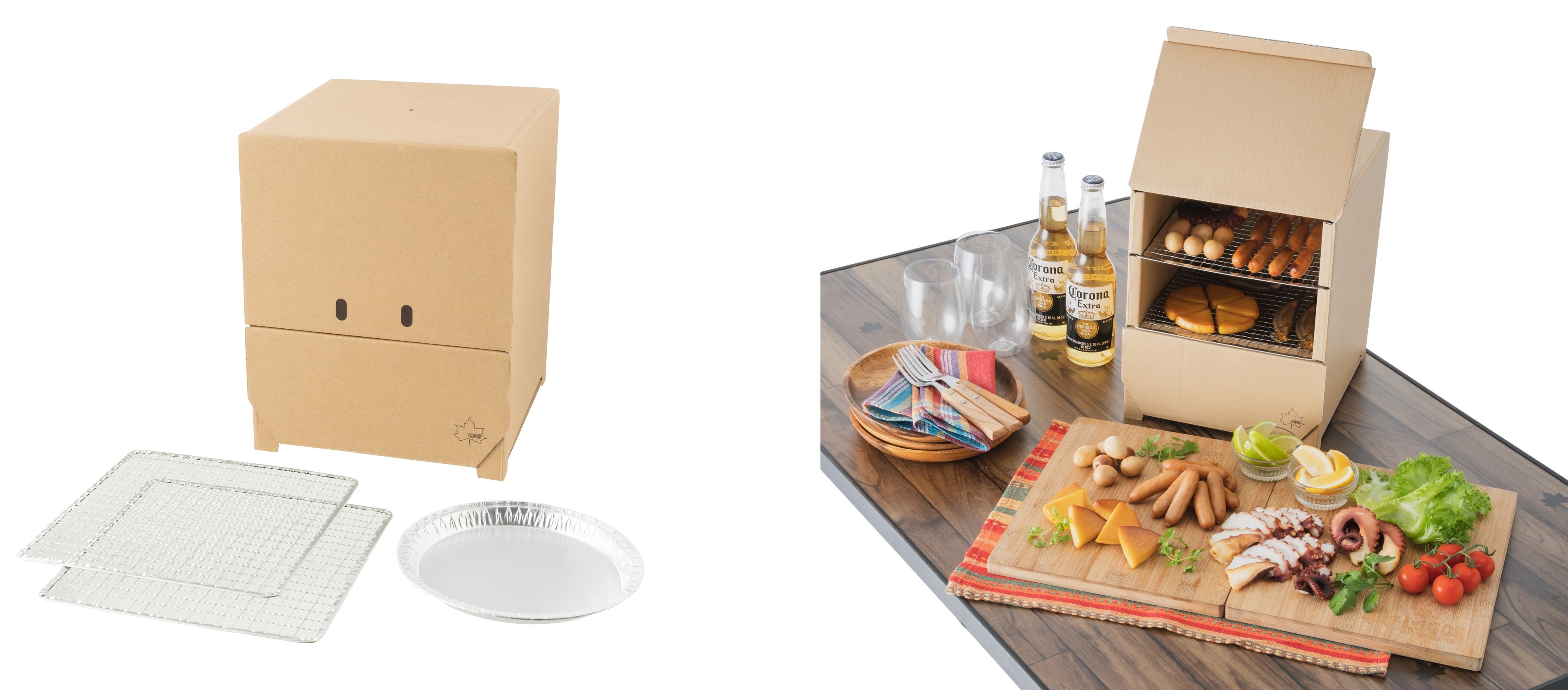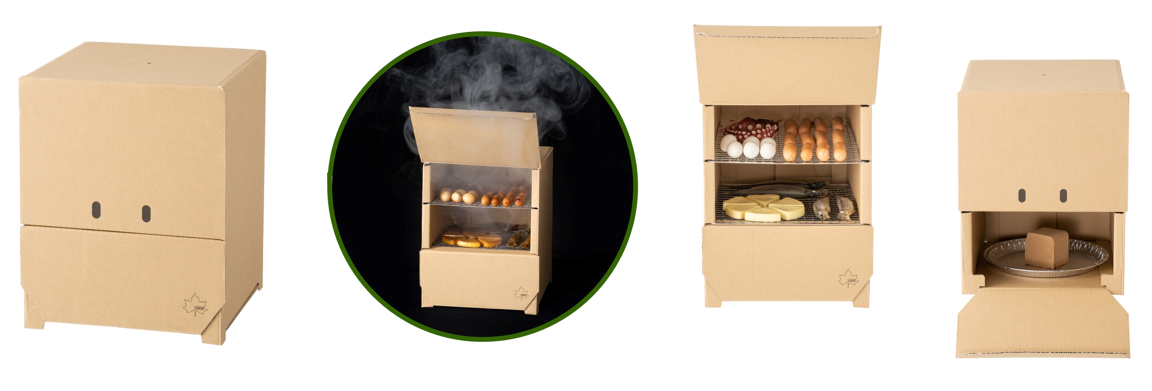 本アイテムは、2枚の網をセットできる2段式構造のスモーカーです。最下段にはアルミ皿に載せたスモークウッド(別売)を置くため、下段ほど香りが強くなり、食材やお好みに合わせた薫製料理を作ることができます。上部の食材部分と下部の燃焼部分にはそれぞれ前開きでフルオープン可能な扉があるので、食材の出し入れや内部の確認がしやすく、作業性も抜群です。本体は天面に1箇所、底面に4箇所の空気穴があることで、空気の流れ道ができるので、スモークウッドの火が消えにくく、長時間調理にも対応します。また本体のデザインは、正面の扉の開閉により、ワクワクとウキウキ2つの表情になるフェイスデザインになっており、調理時間も楽しむことができます。さらに、本体は段ボールでできているため、折って組立てるだけで簡単に準備でき、調理後は破って分解できるので後処理もラクラクです。