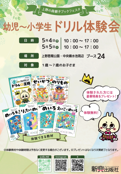 新興出版社(ブース24)と文研出版(ブース33)では、ワクワクする企画をたくさんご用意しております!ブースでは、絵本や児童書などを「読者謝恩価格」でお得に販売いたします!ドリルや塗り絵体験も準備しています。この日だけのスペシャルプレゼントも!