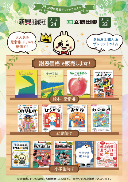 大人気の絵本、児童書、幼児〜小学生向けドリルを会場限定の特別価格でご提供!参加者&購入者プレゼントもご用意しています!