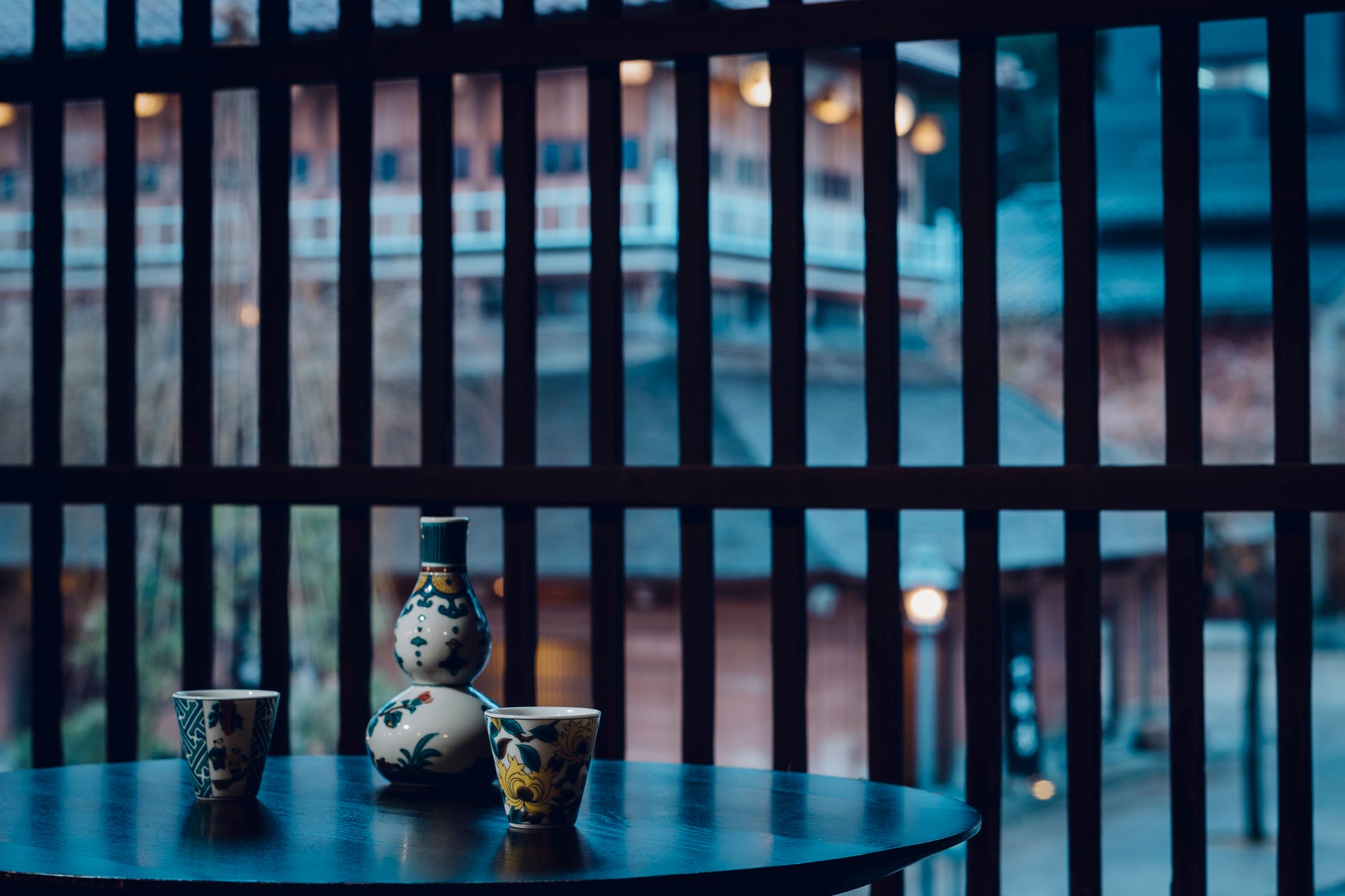 ラウンジでは、伝統の趣ある佇まいの中で、スタッフおすすめの石川県内のお酒とおつまみが用意され、来訪者は自ら選んだ器で味わうことができます。器は専用の棚に九谷焼、山中塗、輪島塗など石川県の伝統工芸品などが多数展示され、その中からお気に入りを探します。また、ラウンジからは明治時代の建築様式を残す共同湯である「古総湯」と、そこを中心として温泉旅館が建ち並ぶ山代温泉固有の景観も見どころです。