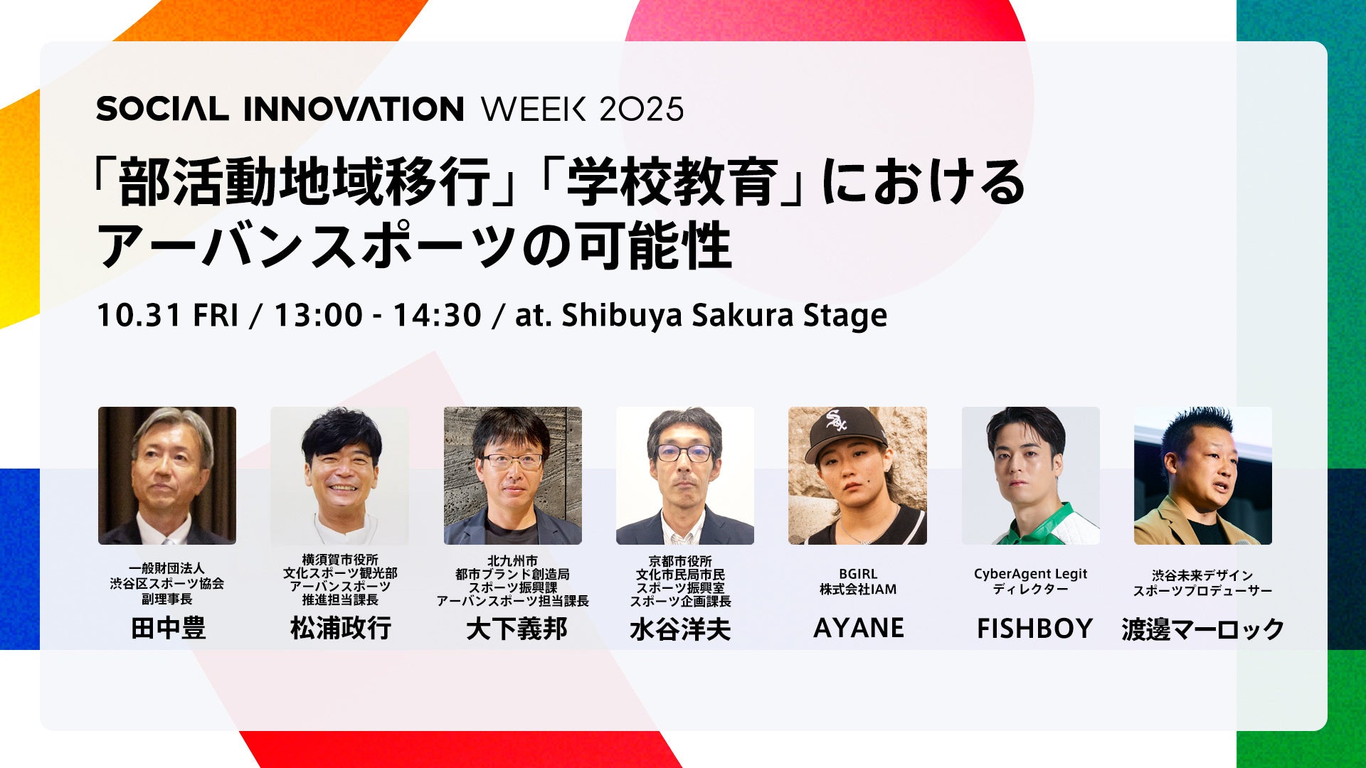 本セッションでは、教育・スポーツ・地域・カルチャーの各分野の実践者が集い、アーバンスポーツが子どもたちにとっての“居場所”となる可能性、地域社会との新たな接点の創出、そしてスポーツを通じた社会課題解決への貢献について、先進自治体の取り組みをもとに議論を深めます。部活動改革のその先を見据え、「人間の権利」としてのスポーツのあり方を再定義し、次世代を育むために今私たちができることを探っていきます。