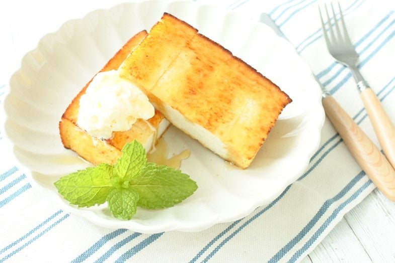 フレンチ液をしみ込ませた食パンに、バター入りマーガリンをトッピングして焼きあげた、ジューシーなフレンチトーストです。