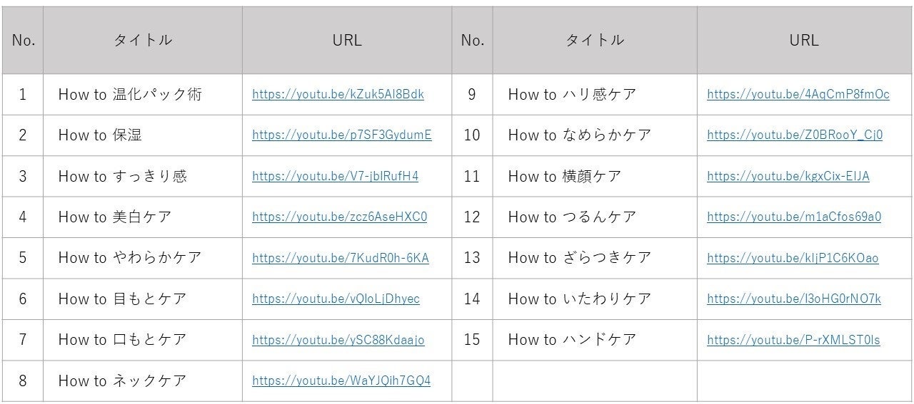 | 15 | How to ハンドケア | https://youtu.be/P-rXMLST0Is |
