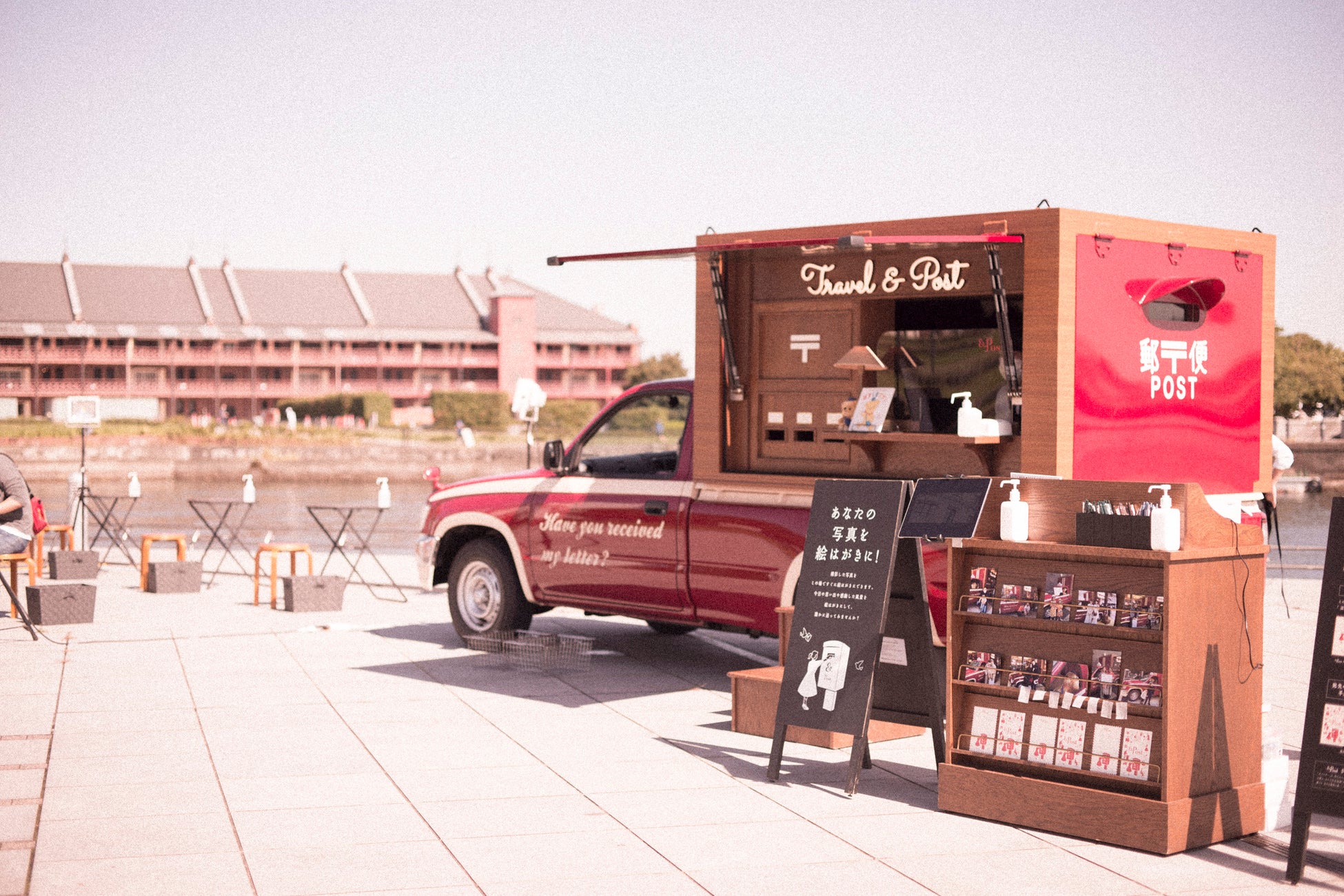 日本にたった1台しかないポストカーは、日本中の絵はがきにしたくなるような風景、瞬間、風物詩を巡る、移動する郵便局です。3種類の投函口がある特別なポストのほか、その場で手紙を書いて、すぐに出すためのツールや機能、サービスを備えています。