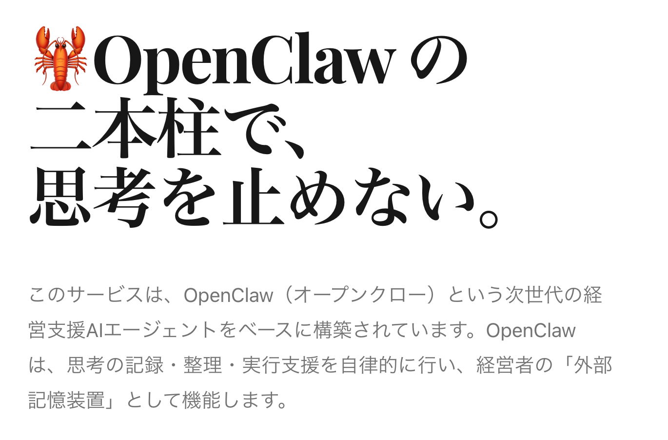 AIエージェント「OpenClaw」で経営者の思考を自動記録・整理・実行支援。2026年4月1日提供開始、3月は先行導入10社を募集。