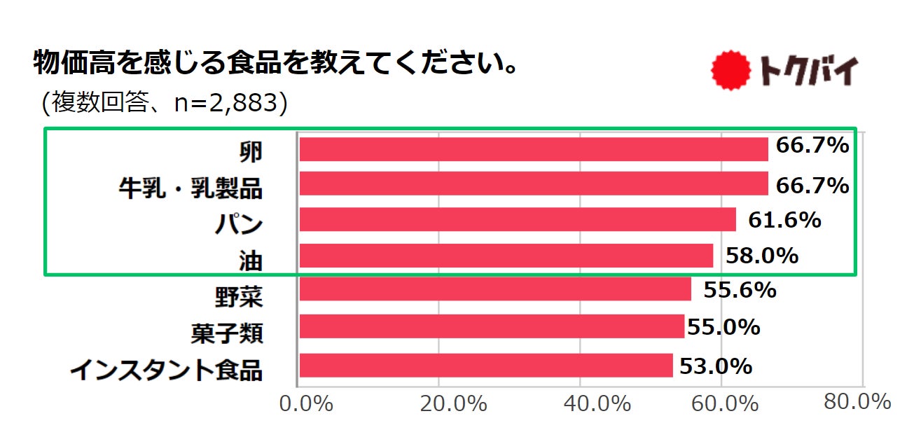 物価高を感じる食品は「卵」「牛乳・乳製品」が約7割、「パン」「油」は約6割で上位にならぶ