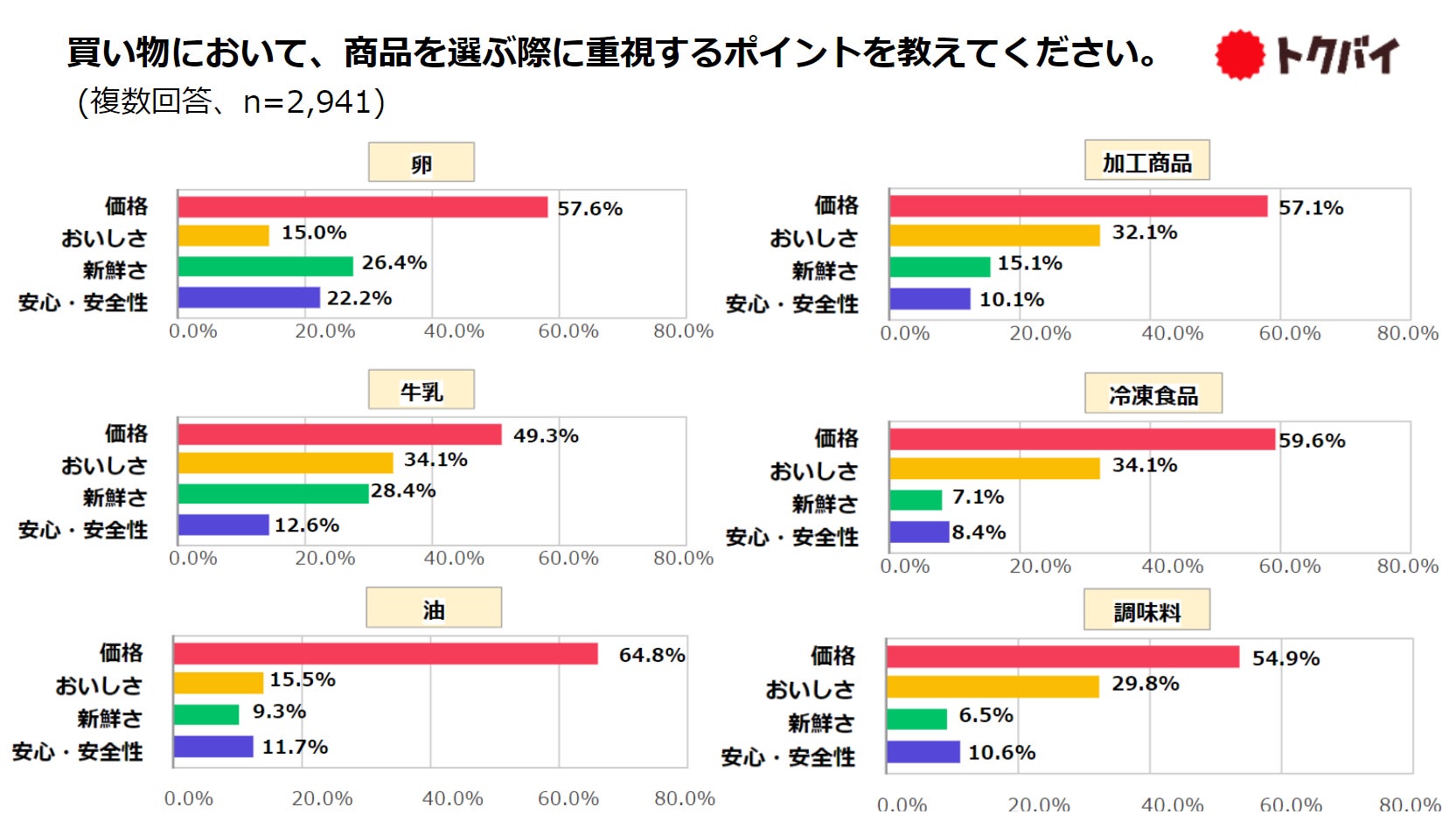 購入頻度の高い「卵」「牛乳」は半数以上が「味」より「価格」を重視。4月から多くの品目が値上げされた「加工食品」や「冷凍食品」の購入も、最も重視されるのは「価格」
