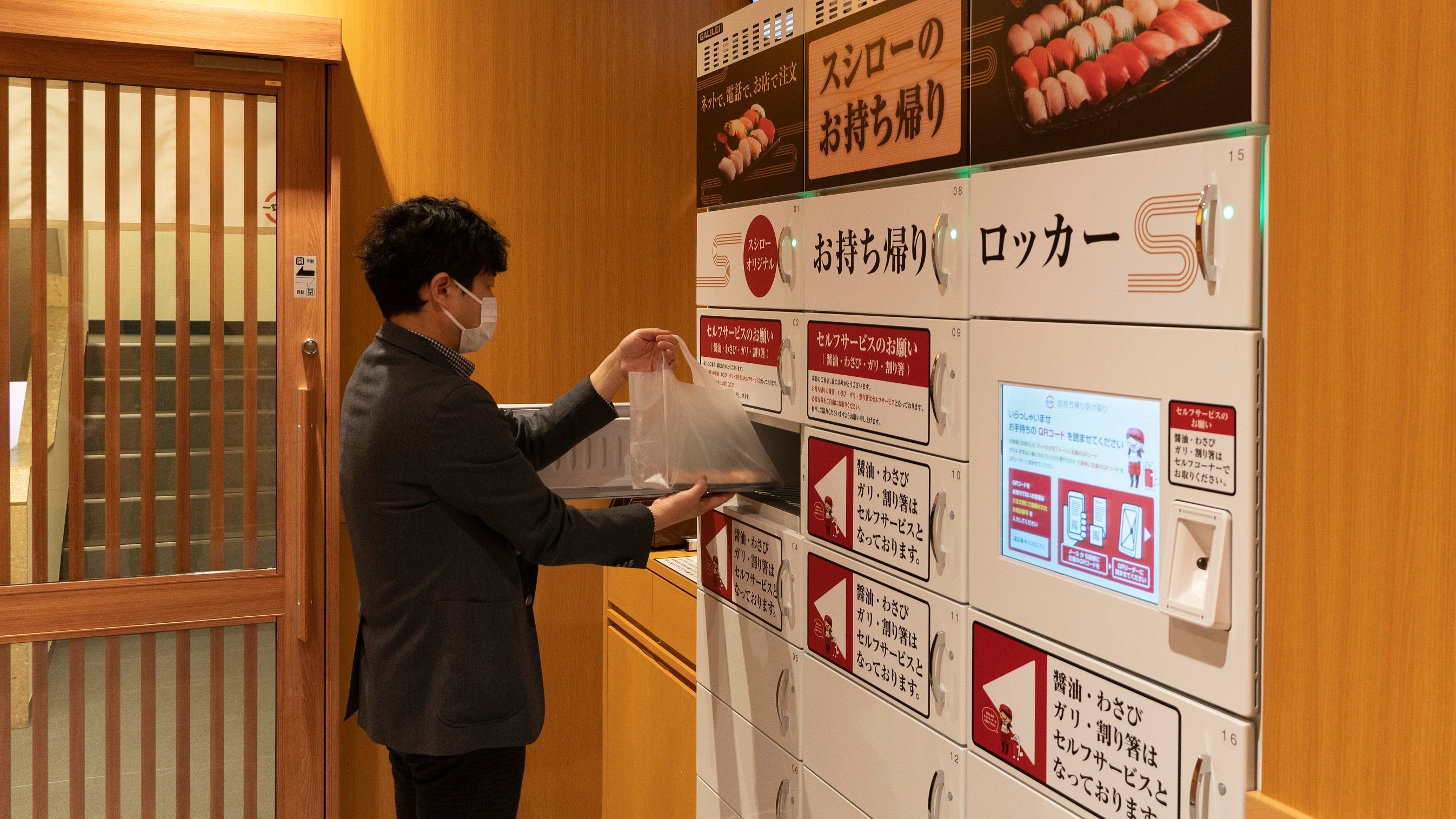 お持ち帰り商品をスムーズに、スタッフと接触することなく受け取れるシステムです。2019年6月に初めて導入され、現在は約500店舗(※)で導入しています。スシロー公式アプリでお好みの商品をご予約いただくとメールでQRコードが届きます。そのQRコードをロッカーに読み込ませることで、温度管理されたロッカーから、わずか数十秒でお持ち帰り商品をお受け取りいただけます。
