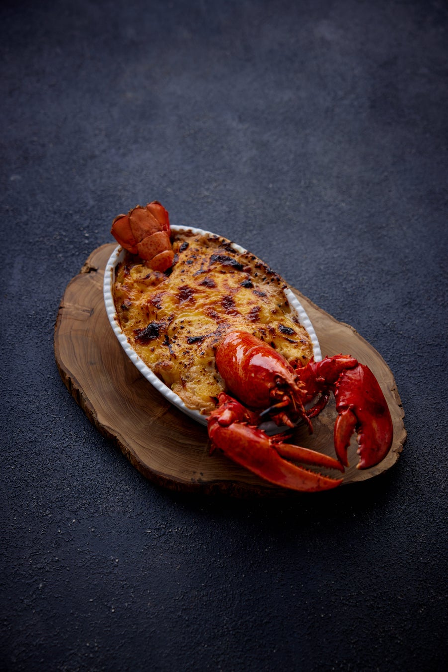 ロブスターを丸ごと一尾使った、ボリュームたっぷりのグラタンです。バターでソテーしてブランデーで香りづけしたホタテ、マカロニと合わせました。ホワイトソースにチーズソースを重ね、アメリカで愛される「マック&チーズ(マカロニ&チーズ)」をイメージ。そのまま食卓に出せる陶器のうつわ入りです。