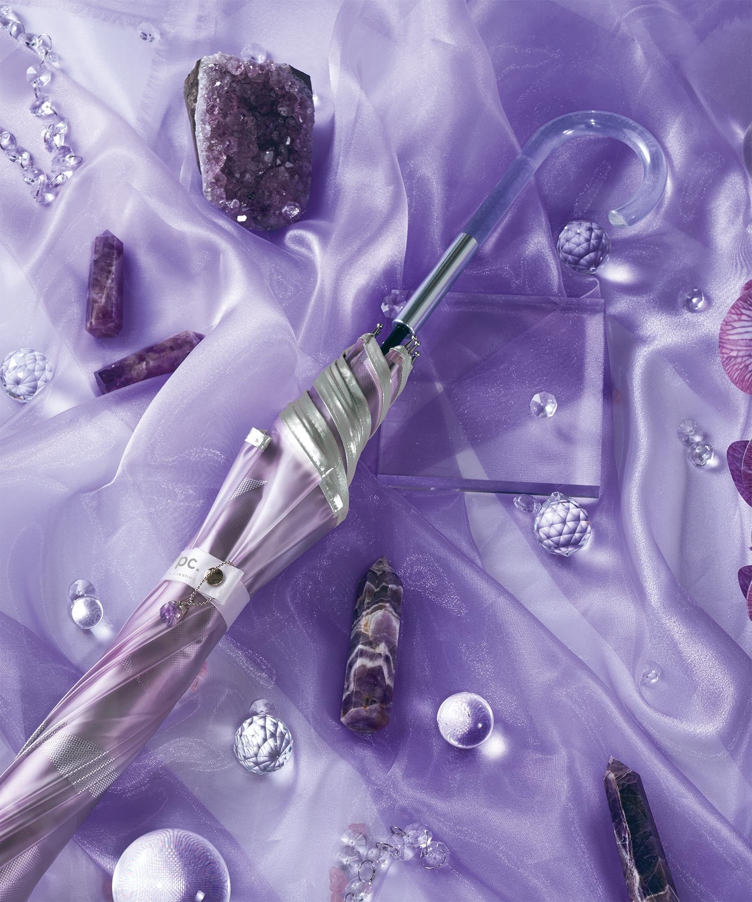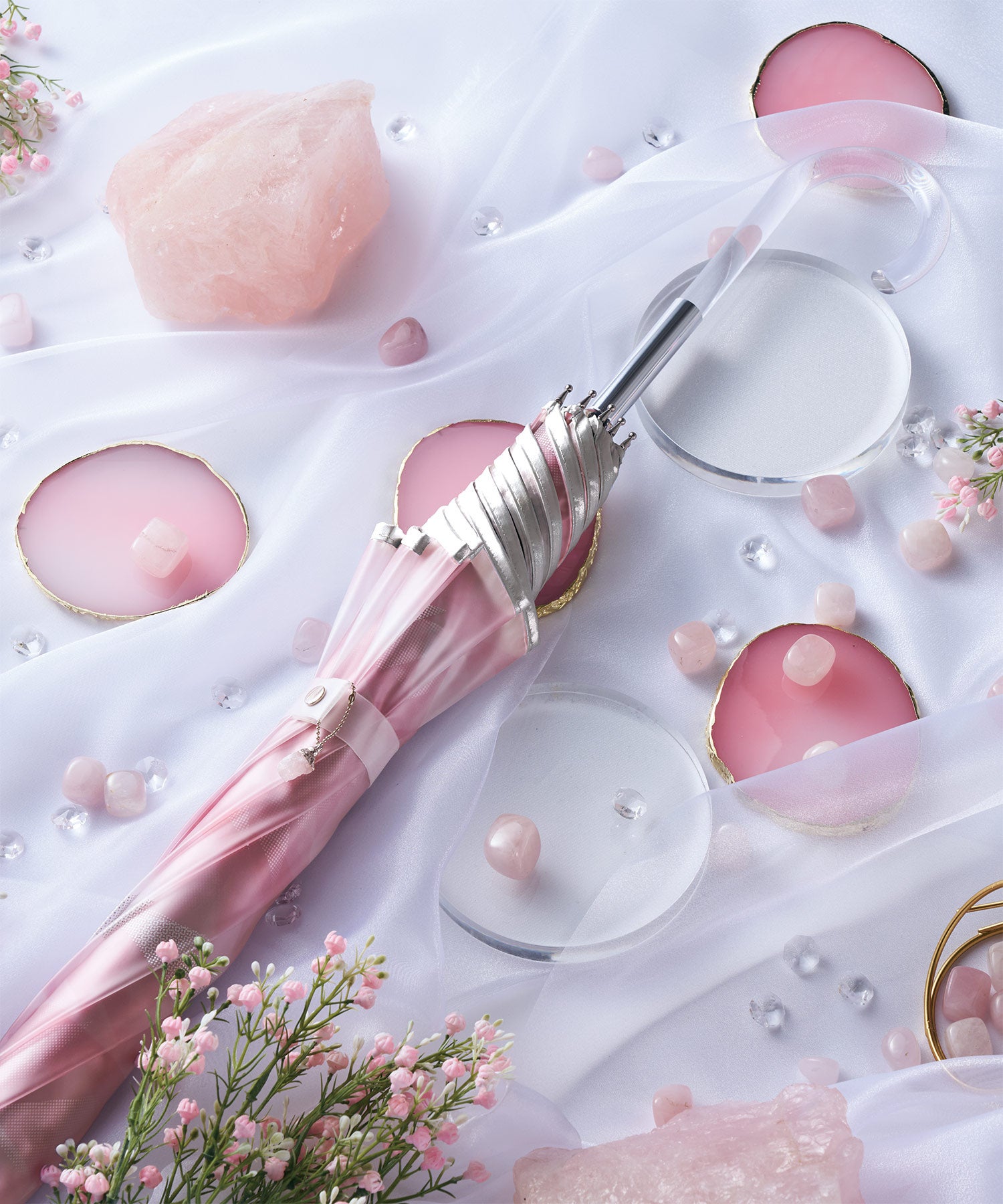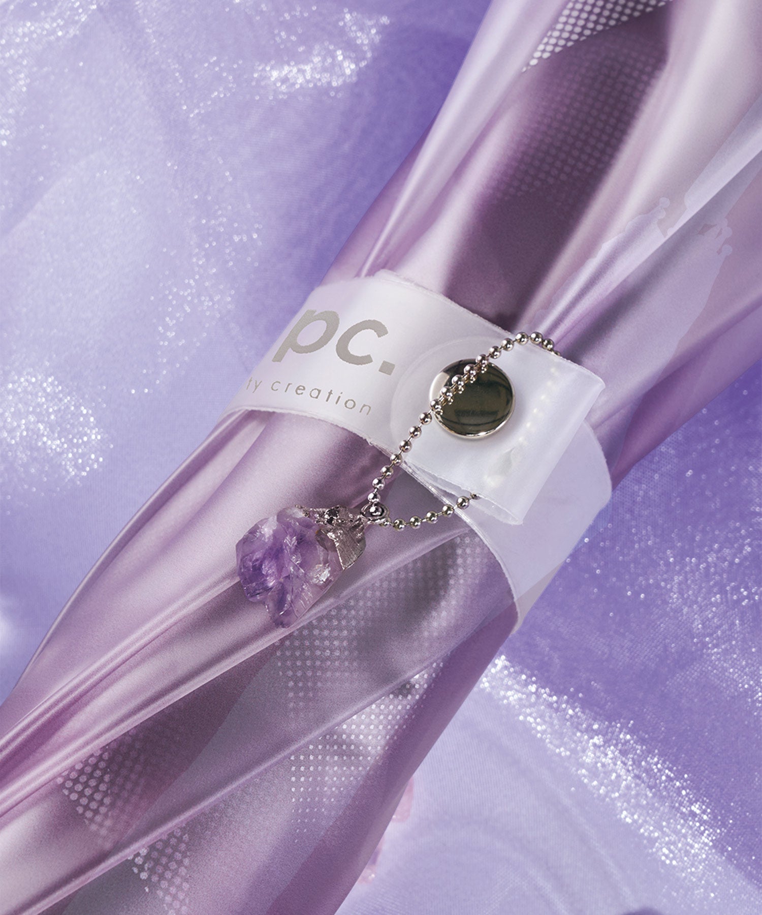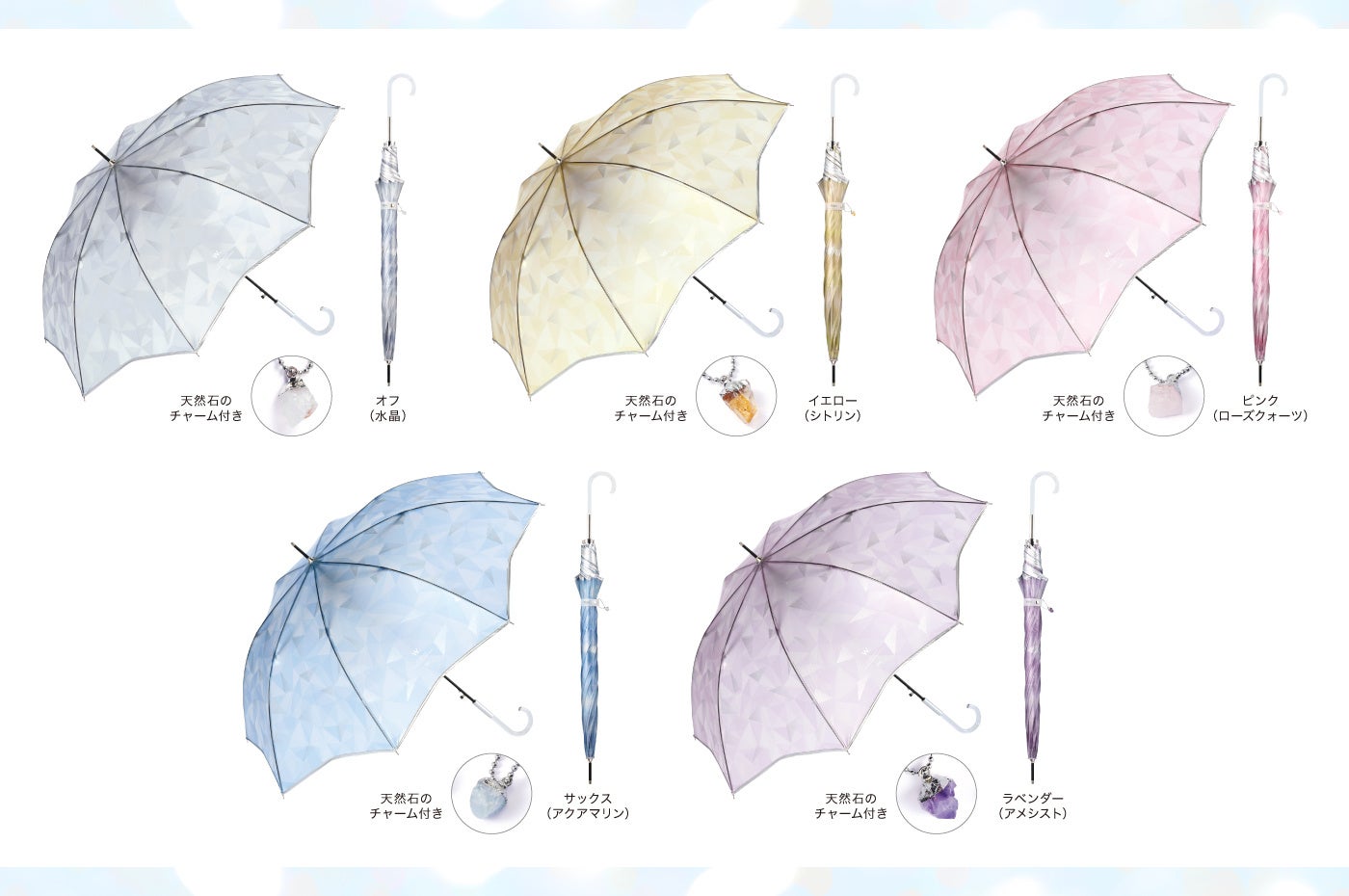 淡いカラーにキラキラと光るシルバーのプリント、そして宝石のカットをイメージしたシャープな形が印象的な5色の『ジェムストーンアンブレラ』。オフにはすべてをクリアに導く水晶、イエローには希望と自信をもたらすシトリン、ピンクには優しい愛を育むローズクォーツ、サックスには流れを整える穏やかなアクアマリン、ラベンダーには心に静けさをもたらす癒しのアメシストの天然石チャームが付いています。雨の日にはあなたの味方となり、幸運の雨をもたらしてくれるはず。
