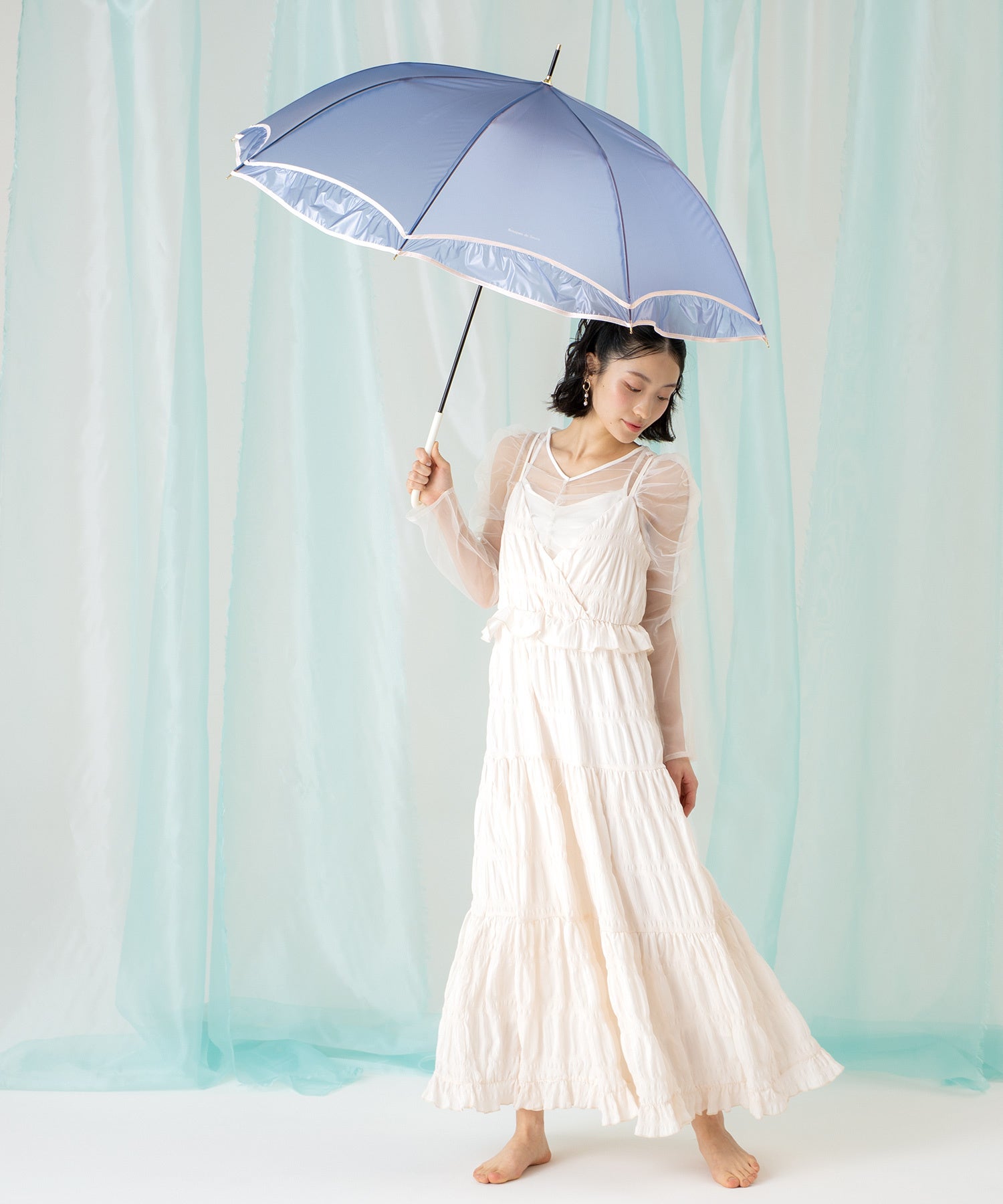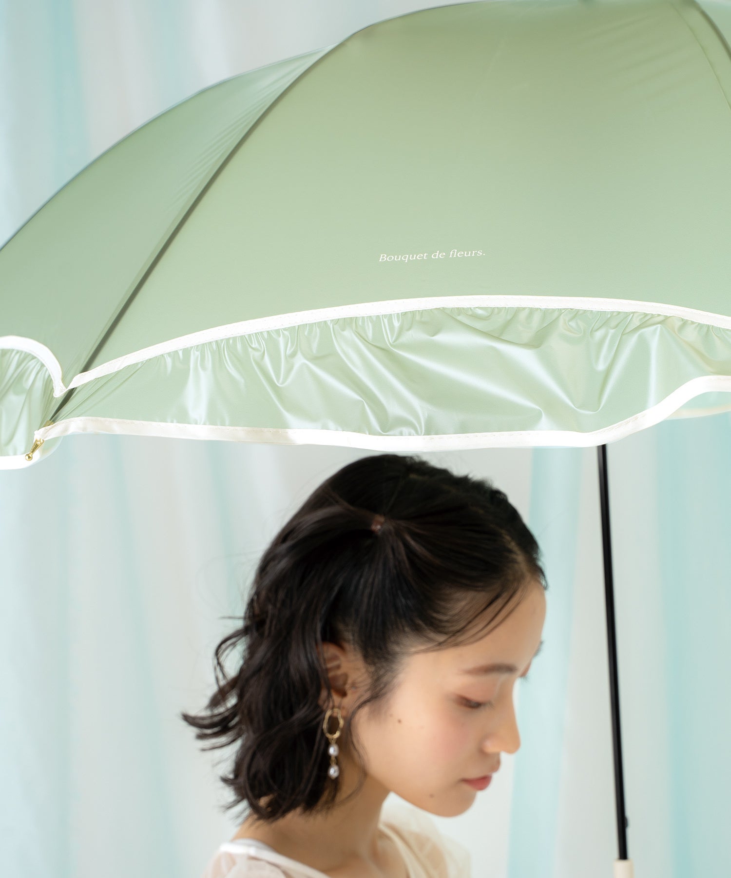 透け感のあるビニール生地に、存在感のあるたっぷりフリルが華やかな『シアーフリルアンブレラ』。ふんわり甘いピンクは可憐でフェミニンに、落ち着きのあるグリーンは上品なスタイルにマッチ、雨の景色に溶け込むブルーは透明感をプラス、どんな装いにも馴染むグレーは洗練された雰囲気を演出します。傘を閉じてもボリュームのあるフリルが広がり、まるで花束のよう。持っているだけで気分が上がるビニール傘です。
