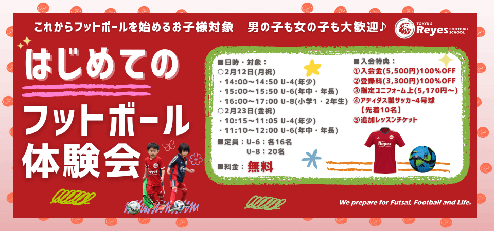 東急Sレイエス フットボールスクール 池袋では、非会員のお子様を対象とした『はじめてのフットボール体験会』を開催いたします。
