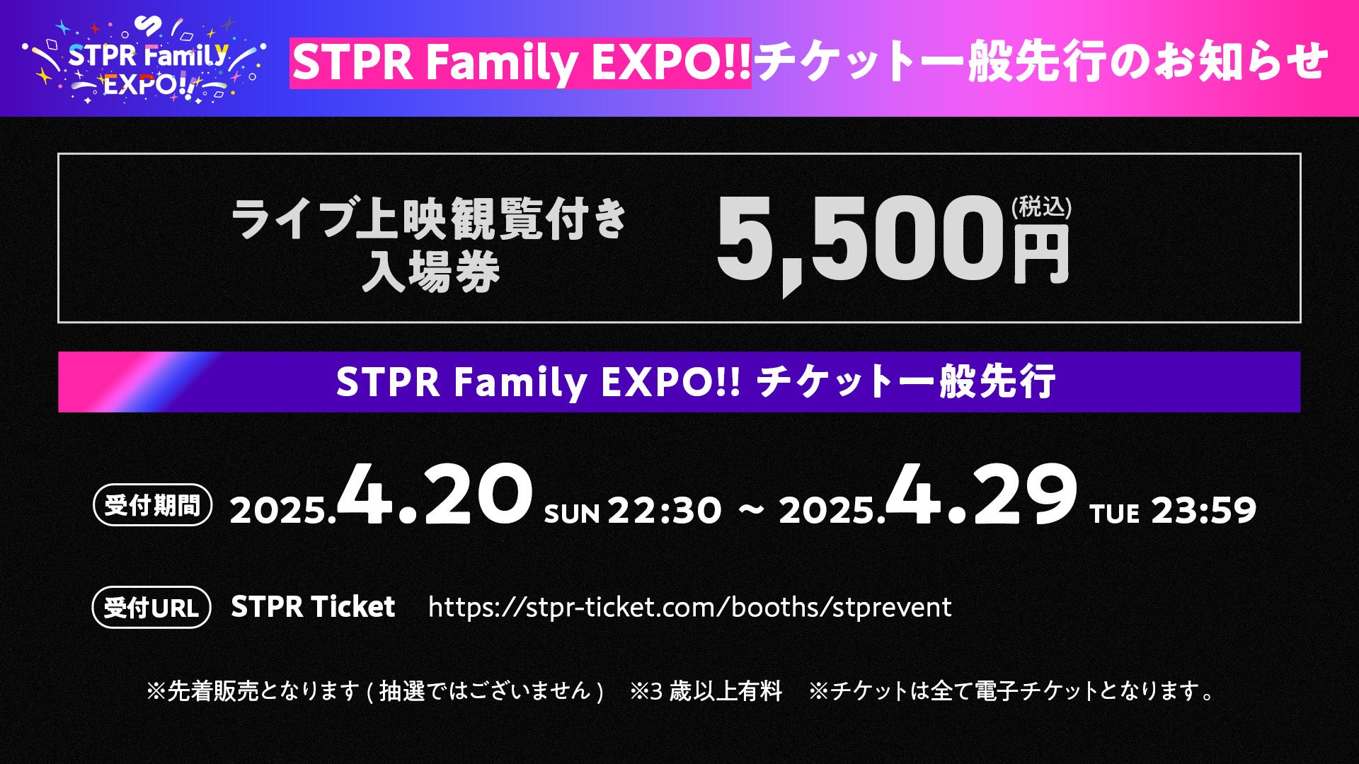入場券の一般先行販売は本日4月20日(日)22:30から開始いたします。すとふぇすの感動をもう一度味わいたいリスナーさん、すとふぇす参加が叶わなかったリスナーさんなどすべてのSTPRリスナーさんに、『STPR Family EXPO!!』を通じてさまざまな「楽しい」を提供いたします。ぜひご来場ください!