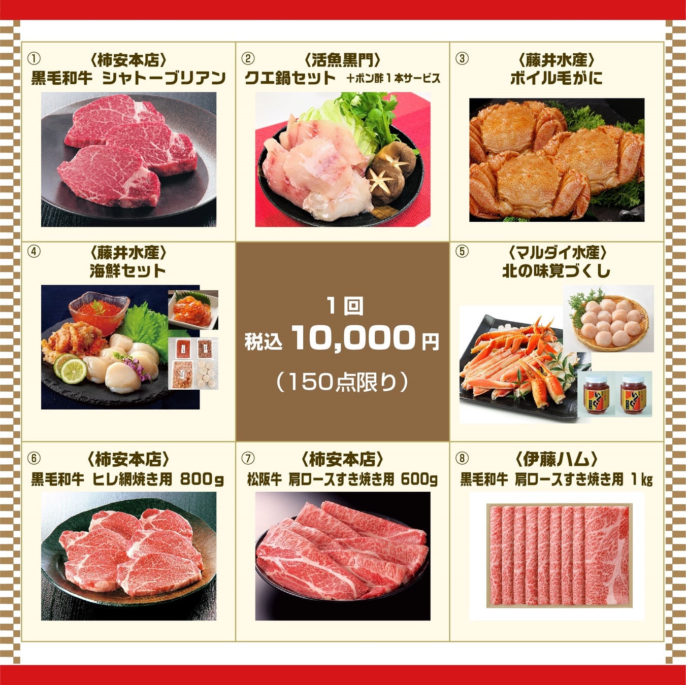 - 【1回 税込5,000円】ボイルずわいがにや松阪牛すきやき用など、お得に楽しめるグルメが当たります。※400点限り