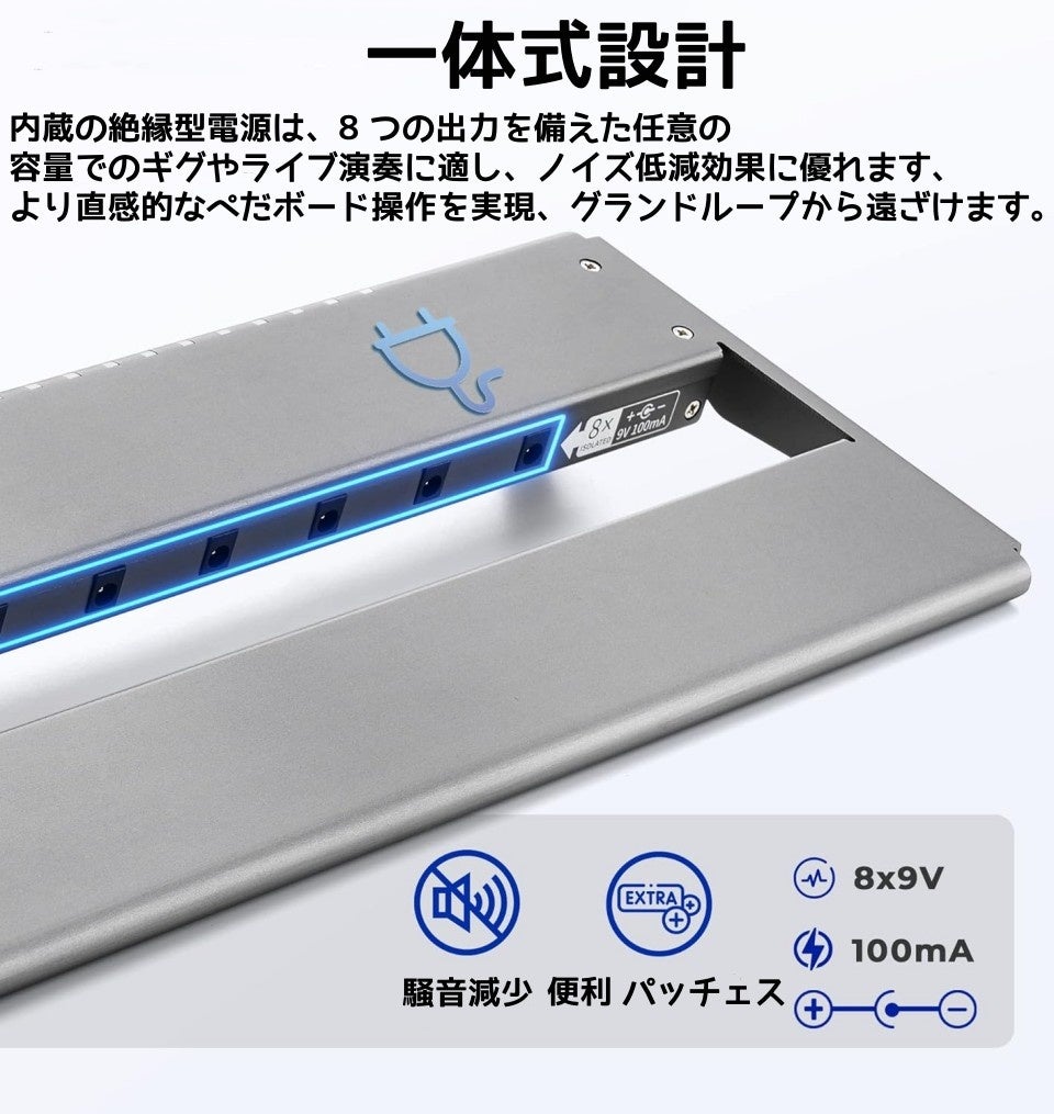 ペダルボードと別個の電源ユニットを購入する手間と費用をかける代わりに、Synidoペダルボードは独立した電源を内蔵します、この一体化のデザインは操作簡単になります。プラグを差し込んで踏み鳴らしてみると、出力は十分に分離され、すべてのペダルがオンの状態でもノイズの問題は発生しにくいです。