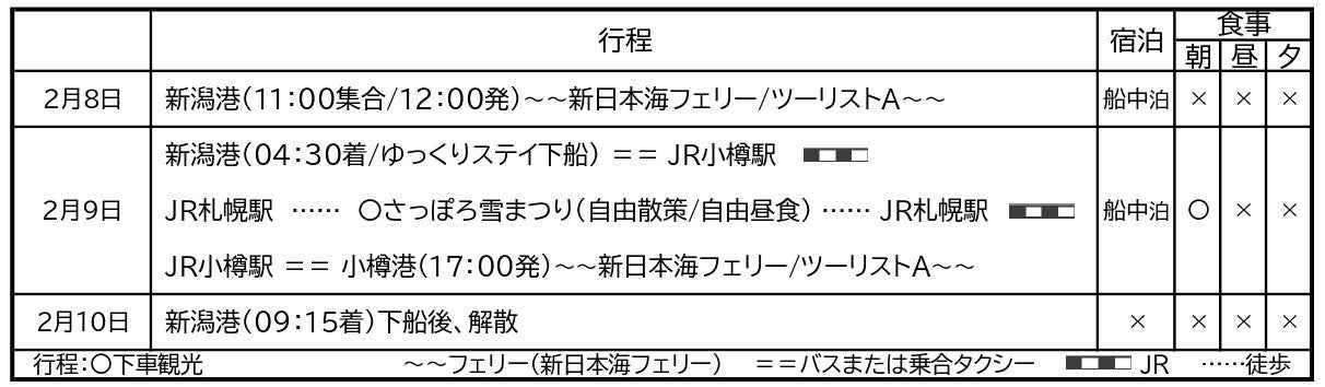 新日本海フェリーの新潟-小樽航路を利用し、船内2泊・現地0泊で楽しめる冬の北海道旅行